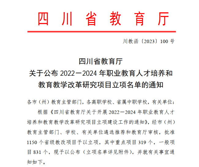 近日,四川省教育厅发布了《四川省教育厅关于公布2022-2024年职业教育人才培养和教育教学改革研究项目立项名单的通知》(川教函【2023】100号),学院19个项目获批立项,其中重点项目4项、一般项目15项,获批项目数量和质量均创历史新高。学院高度重视教育教学改革研究与实践,围绕立德树人根本任务不断推进教育教学改革创新。学院将以此为契机不断深化三教改革,致力研究和解决职业教育改革发展中的突出问题、关键环节,培育一...