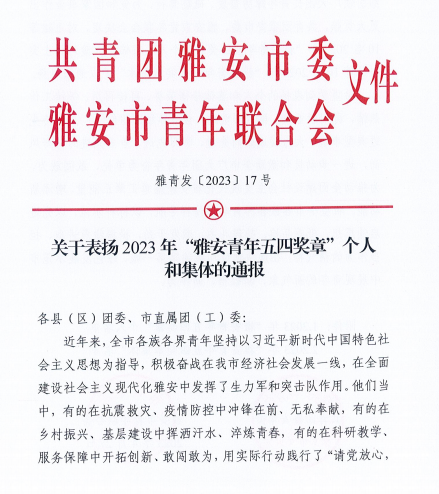 近日,共青团雅安市委发布了《关于表扬2023年“雅安青年五四奖章”个人和集体的通报》和《关于表扬2022年度雅安市五四红旗团委(团支部)、雅安市优秀共青团员、雅安市优秀共青团干部的通报》。智能制造与信息工程学院教师胡月刚荣获“雅安青年五四奖章”个人;中医与康复养生学院“中医红”志愿服务队荣获“雅安青年五四奖章”集体;临床医学院团总支荣获雅安市五四红旗团支部称号;药学与检验学院团总支书记鲜敏荣获雅安市优秀...