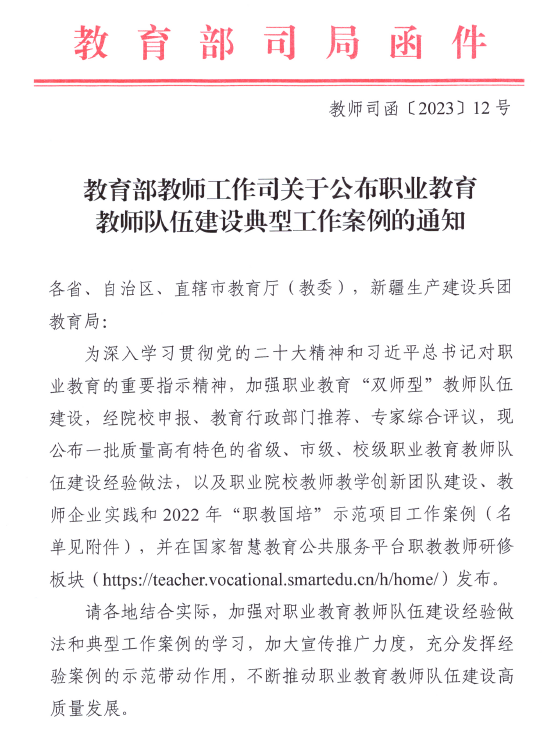 06-07-2023学院教师队伍建设经验入选教育部职业教育教师队伍建设典型工作案例