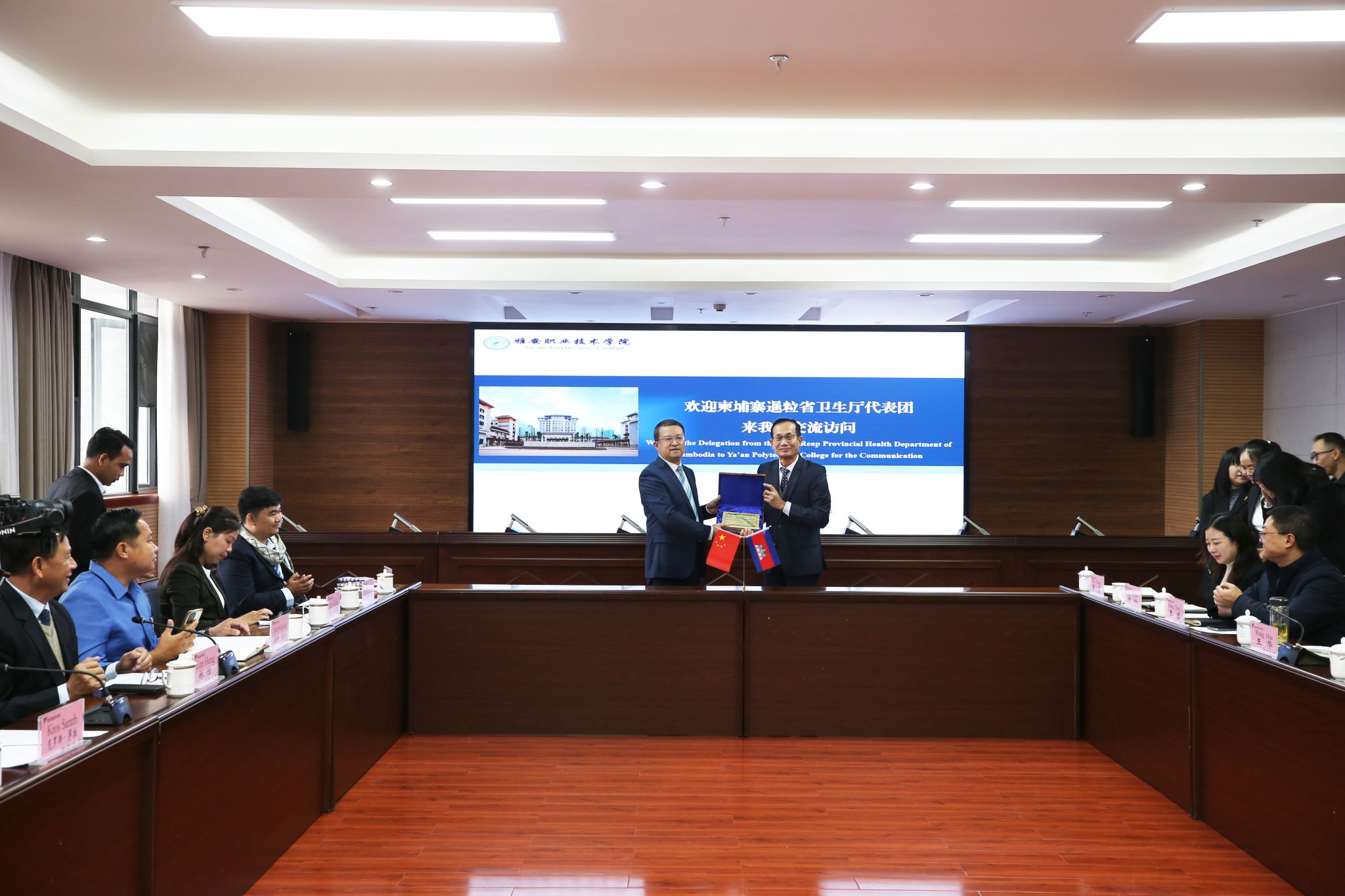 11月21日上午,由柬埔寨暹粒省卫生厅厅长克罗斯·萨拉(Kros Sarath)率代表团10人来学院进行交流访问,并在经开区校区综合楼311会议室座谈。学院党委书记李春模,党委副书记、院长黄诚,党委委员、副院长樊正康,雅安市卫生健康委主任、雅安市中医药管理局局长王华,雅安市经济合作和外事局相关负责人和学院党政办、教务处、继续教育与国际交流处、相关二级学院负责人参加座谈,会议由黄诚主持。在学院访问期间,代表团参观了学...