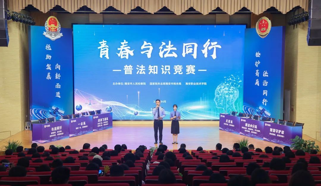为深入学习贯彻习近平法治思想,进一步加强校园法制教育工作,增强同学们的法律意识和法制观念,提高法律知识水平,营造文明和谐的校园环境,4月26日,beat365官网联合雅安市人民检察院、雅安市税务局在经开区校区聚雅厅举办“青春与法同行”普法知识竞赛。雅安市人民检察院检察长范文清、雅安市税务局局长罗强、学校党委书记李春模、党委副书记杨洪媛,各职能部门负责人、教师代表、学生代表和参赛队伍队员共计400余人参与。活动伊始...