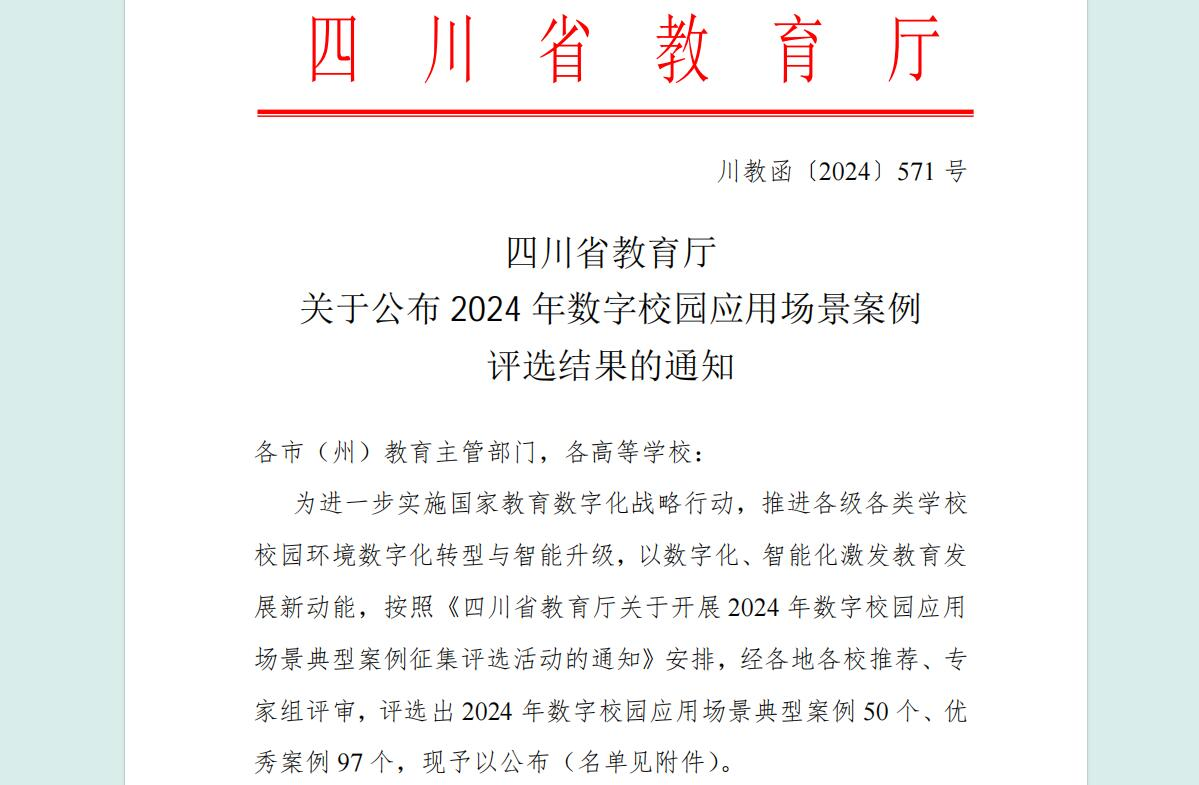 01-10-2025喜报!学校数字化案例入选四川省教育厅2024年数字校园应用场景典型案例和四川省2024年国家智慧教育平台应用案例