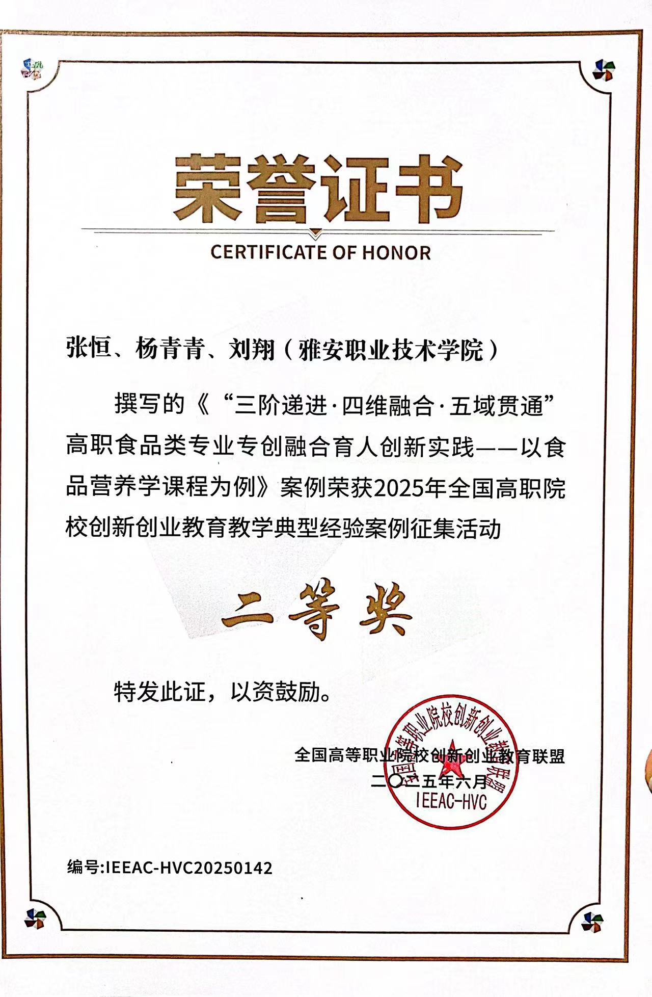 近日,全国高等职业院校创新创业教育联盟公布了2025年全国高职院校创新创业教育教学典型经验案例评选结果,beat365官网《“三阶递进·四维融合·五域贯通”高职食品类专业专创融合育人创新实践——以食品营养学课程为例》荣获二等奖。该案例依托《食品营养学》课程,将思政教育、专业教学、双创训练三线并进,构建“三阶递进、四融贯通、五域协同”进阶式育人模式,打造“认知—实践—创新—竞赛—创业”全链条培养闭环。五年来,累计开...