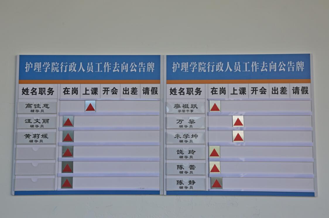 为进一步贯彻落实“不忘初心,牢记使命”主题教育活动总要求,结合实际工作找差距,抓落实,护理学院党总支开展党员干部“亮身份、明去向、树形象”活动。党员干部工位摆放身份牌,向师生亮明身份;办公区域外安装工...