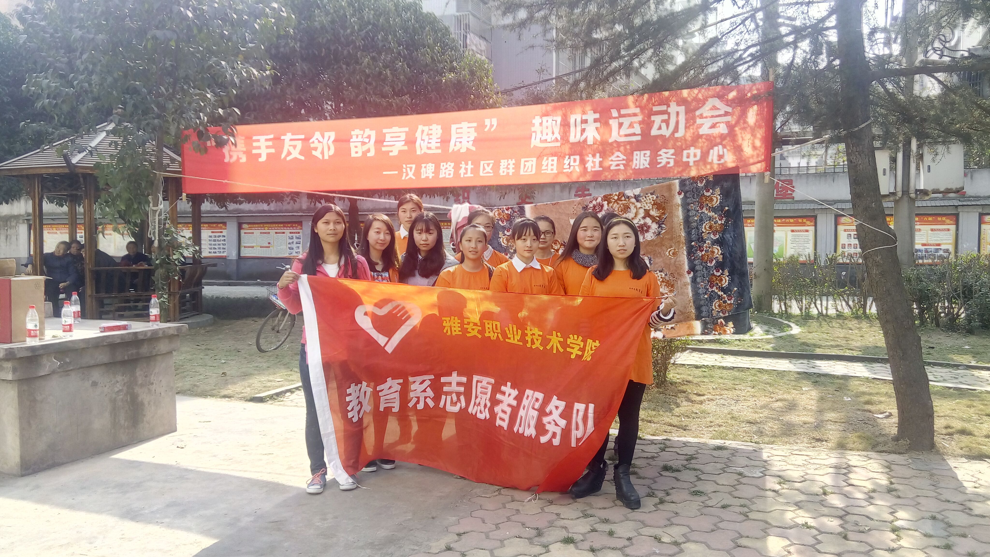 【本网讯】3月3日下午,教育系青年志愿者服务大队的高志玲、邓燕、马敏、吴倩等11名成员参加了由汉碑路社区群团组织社会服务中心在爱国苑小区健身中心开展的 “携手友邻,韵享健康”趣味运动会。 志愿者们积极协助...