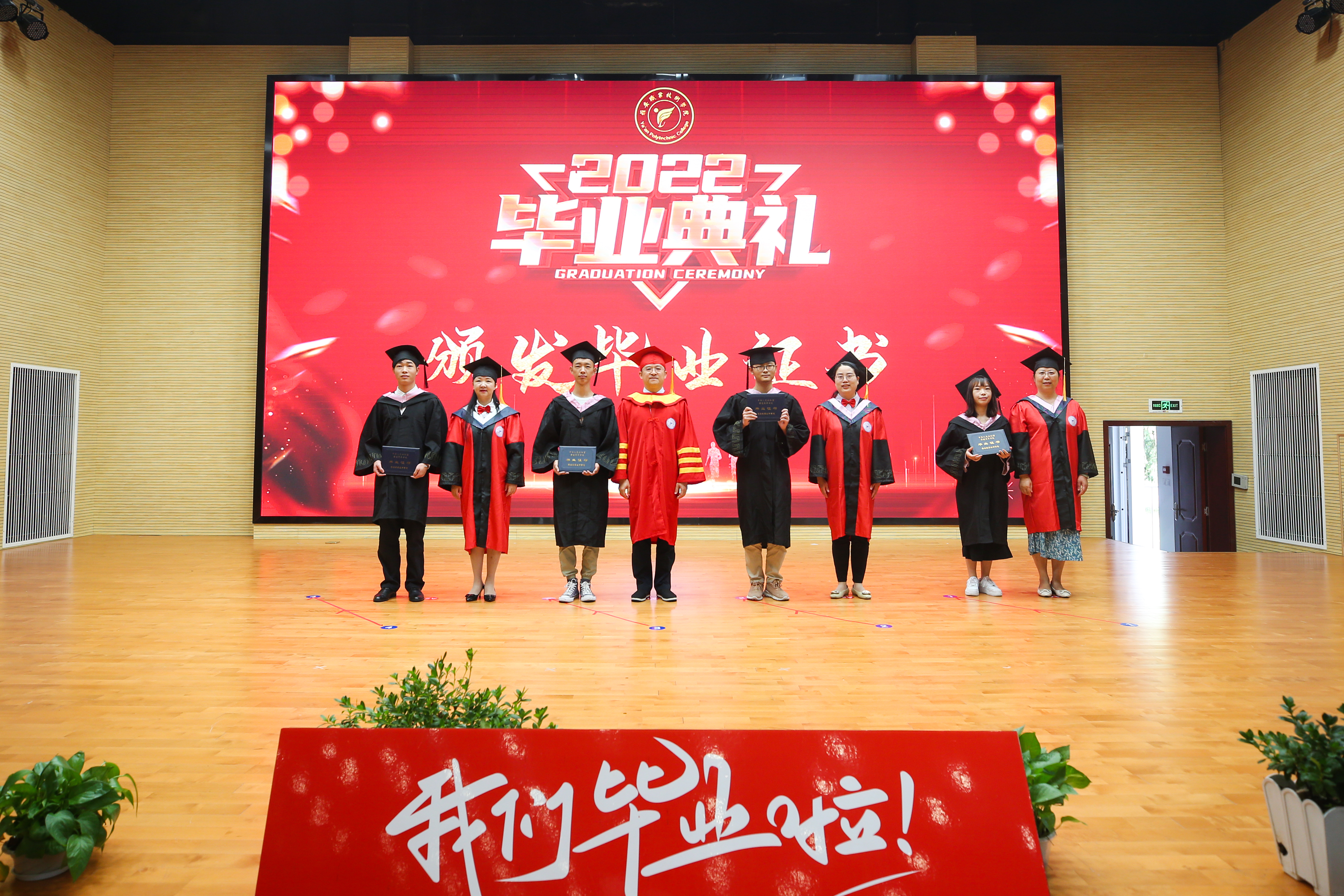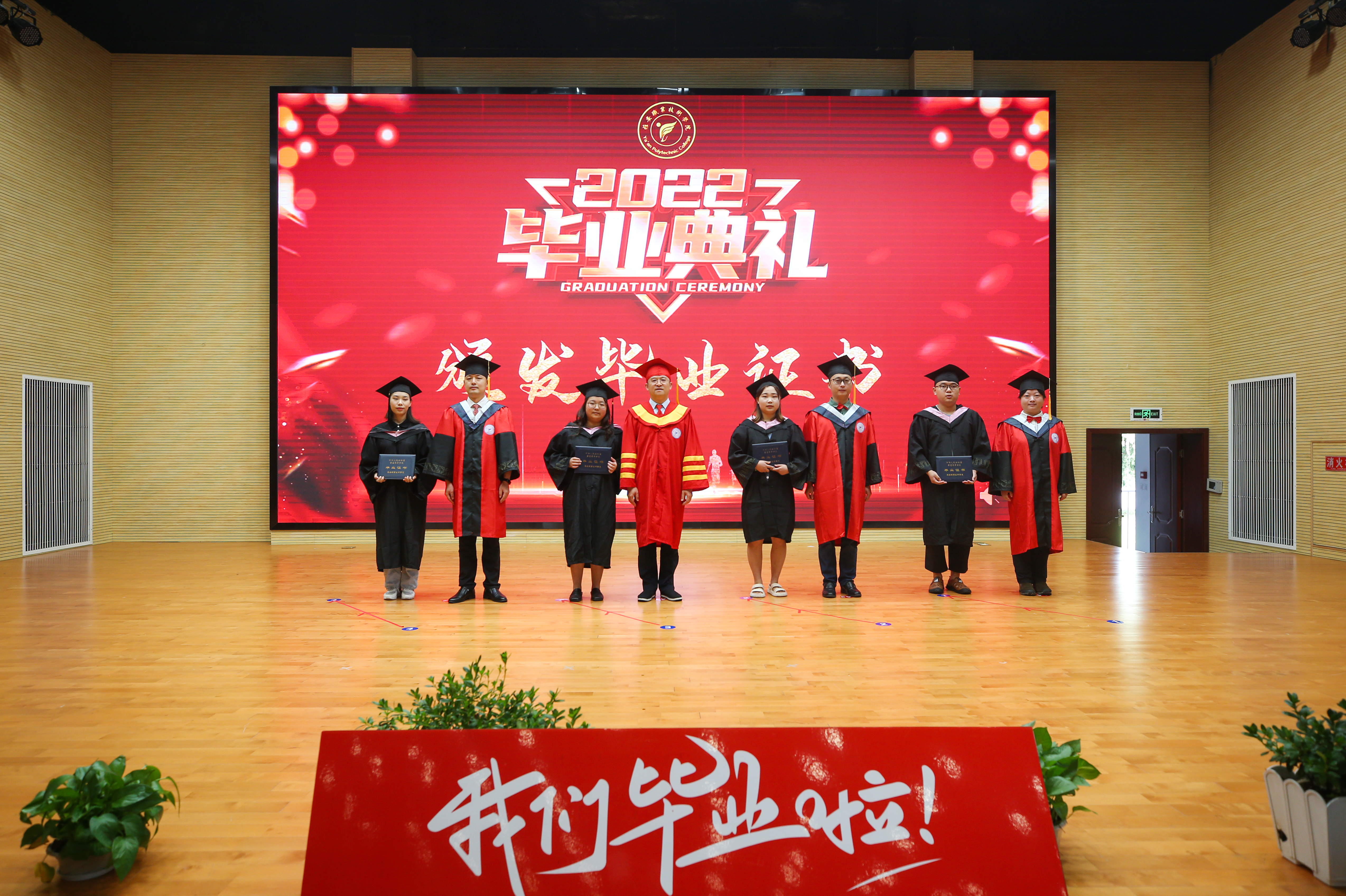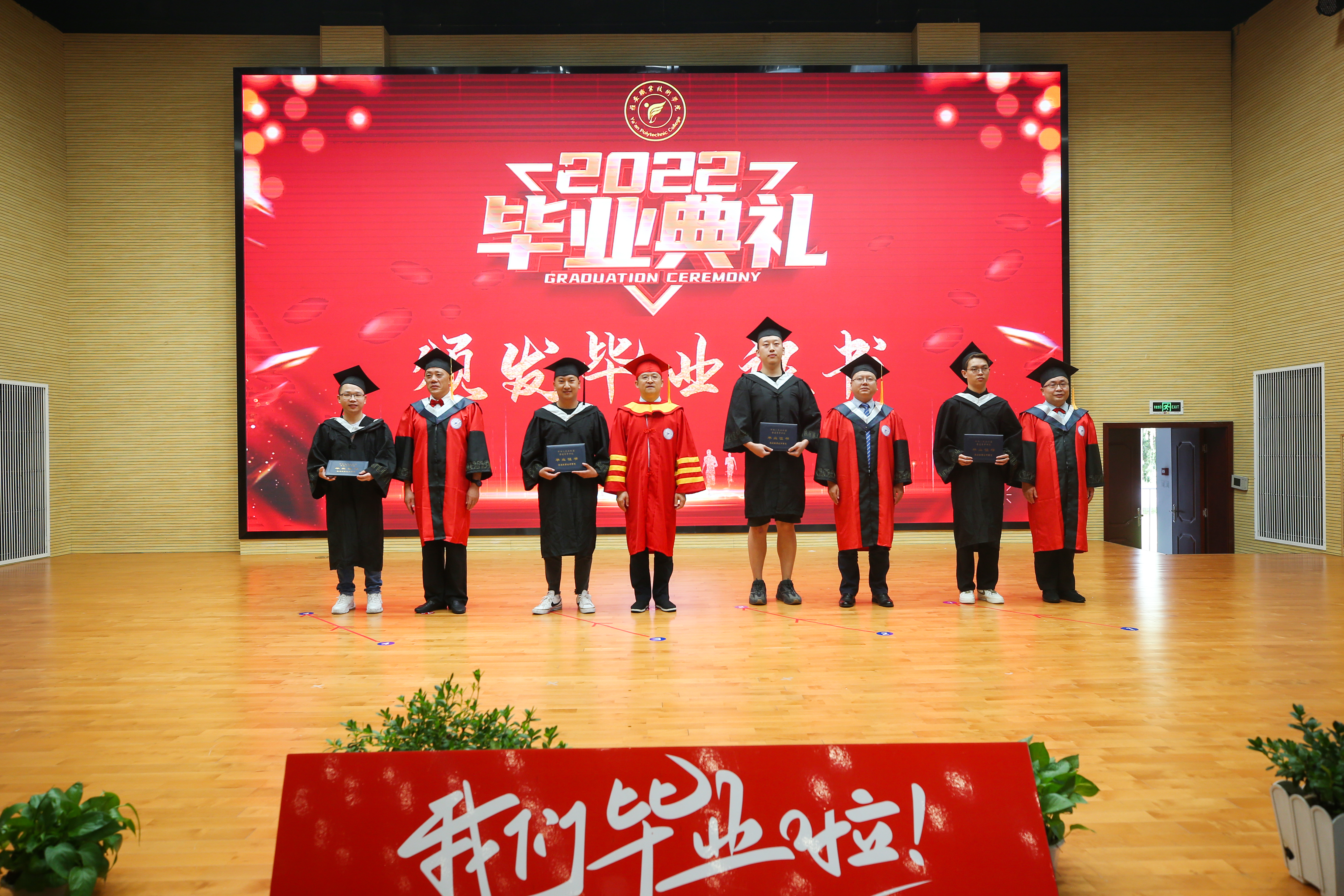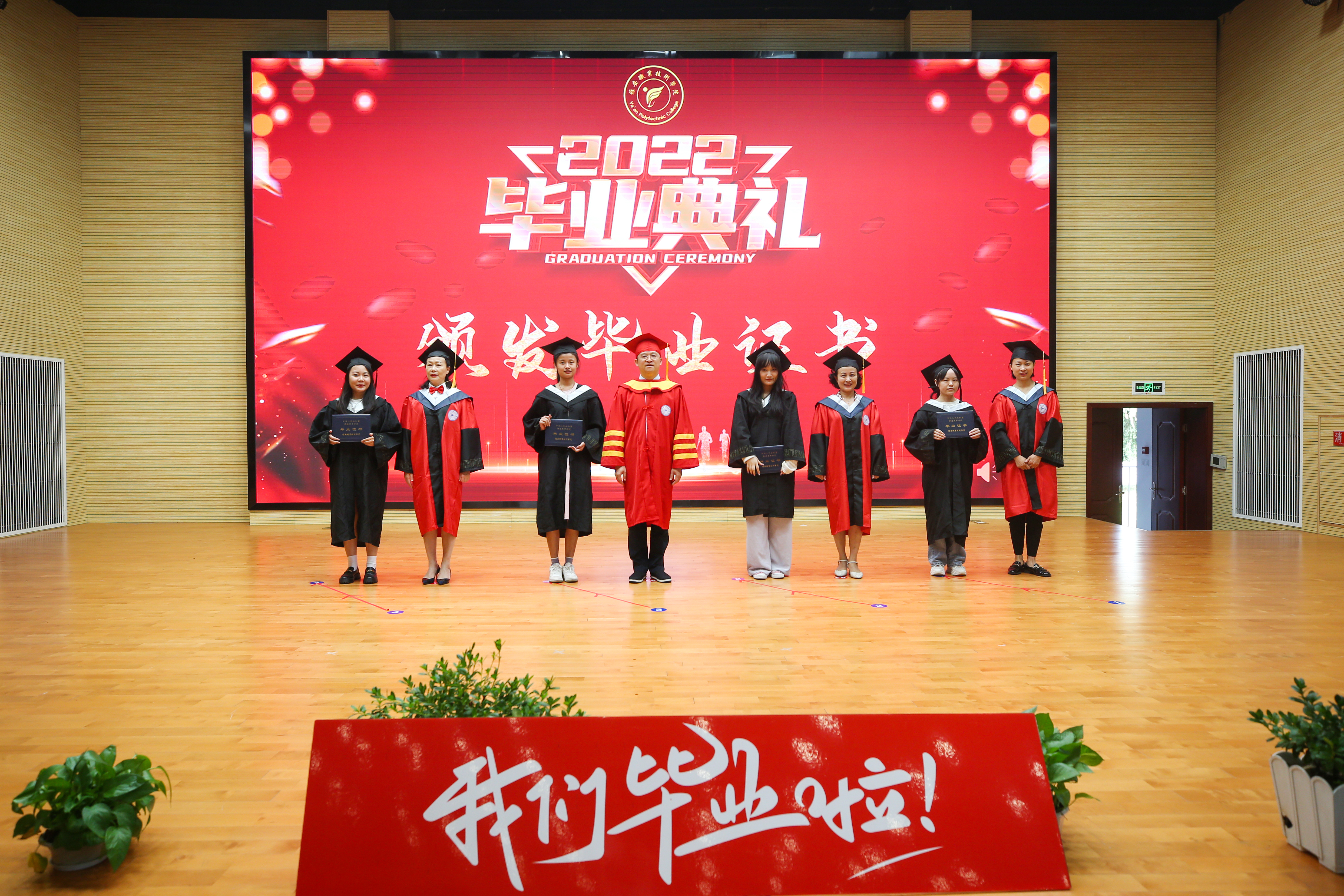 随后,黄诚与学院其他领导、各二级学院院长、教师代表共同为现场毕业生颁发毕业证。毕业生们分组上场领取毕业证并与颁证教师合影留恋。在毕业典礼的尾声,同学们共同唱响了《青春纪念册》,视频《给十年后自己的一封信》的播放展现了同学们对未来的憧憬与畅想。