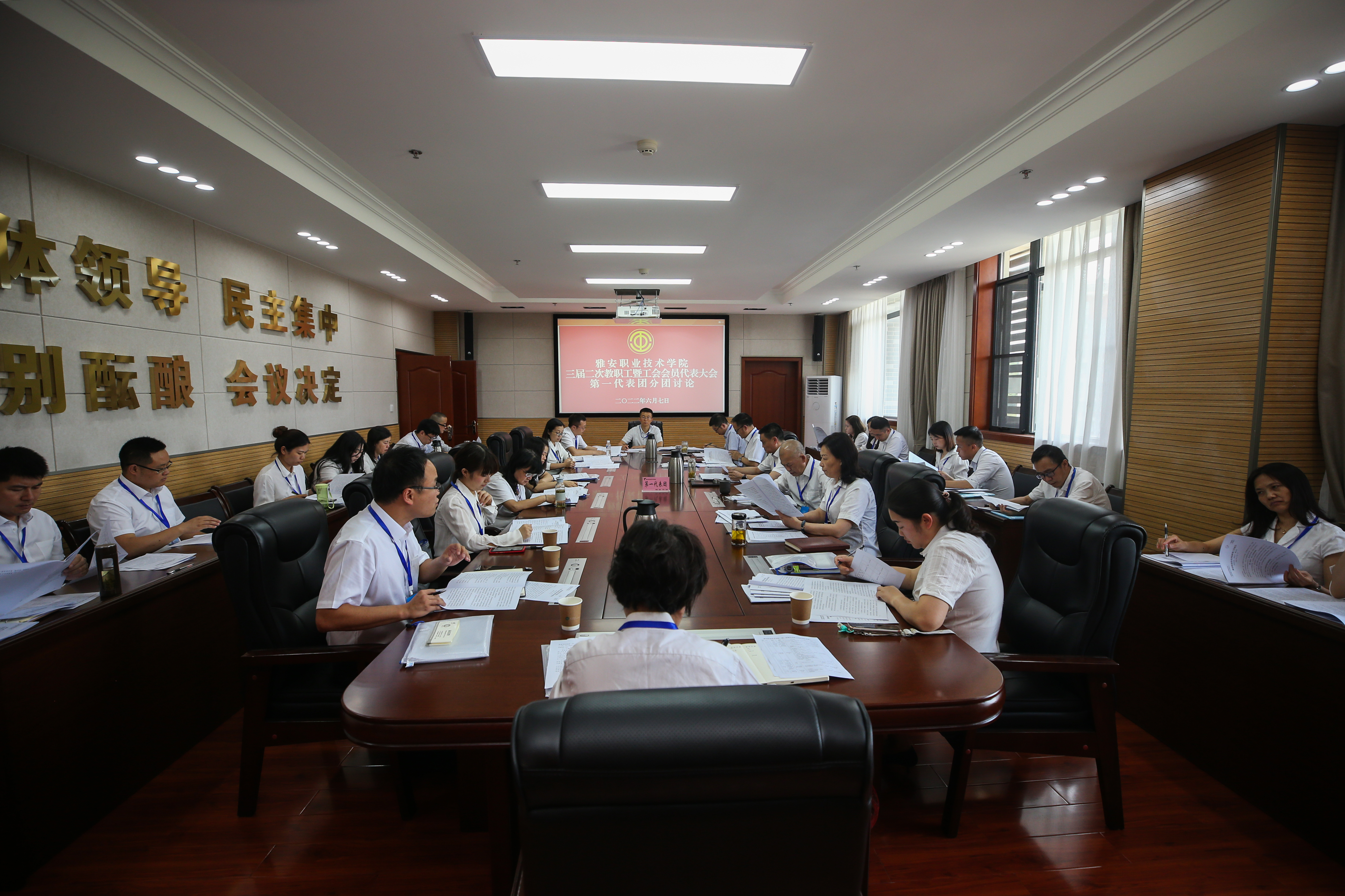 四个代表团分别对学院工作报告、工会工作报告、财务工作报告、工会经费审查报告、三届二次教代会提案审查报告、学院章程修订稿、公共租赁房管理办法及教师年教学工作量与课时费标准调整方案进行了认真讨论和审议,并在大会上表决通过了上述报告和文件。