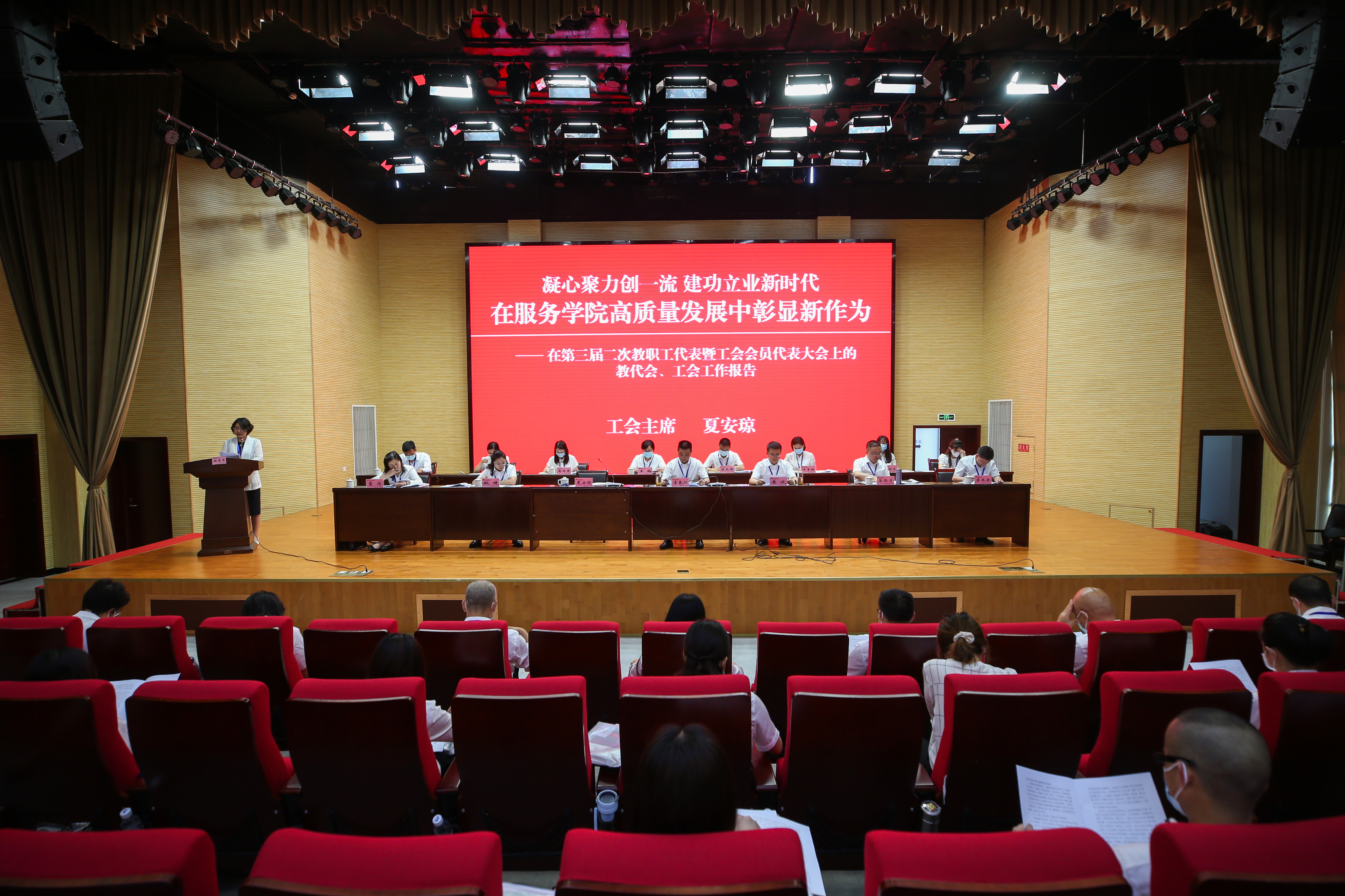 6月7日,学院三届二次教职工代表暨工会会员代表大会在经开区校区隆重召开。学院党政领导、教职工正式代表、列席代表130余人参加会议,党委书记李春模出席并讲话,党委副书记、院长黄诚向大会作工作报告,工会主席夏安琼主持大会。