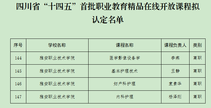 近日,四川省教育厅公示了“十四五”首批职业教育精品在线开放课程认定名单,beat365官网《基本护理技术》《内科护理》《妇产科护理》和《医学影像设备学》,共四门课程被认定为省首批精品在线开放课程。此次教育厅共认定了150门课程,其中高职课程145门,中职课程5门,beat365官网上述四门课程入选认定名单。
