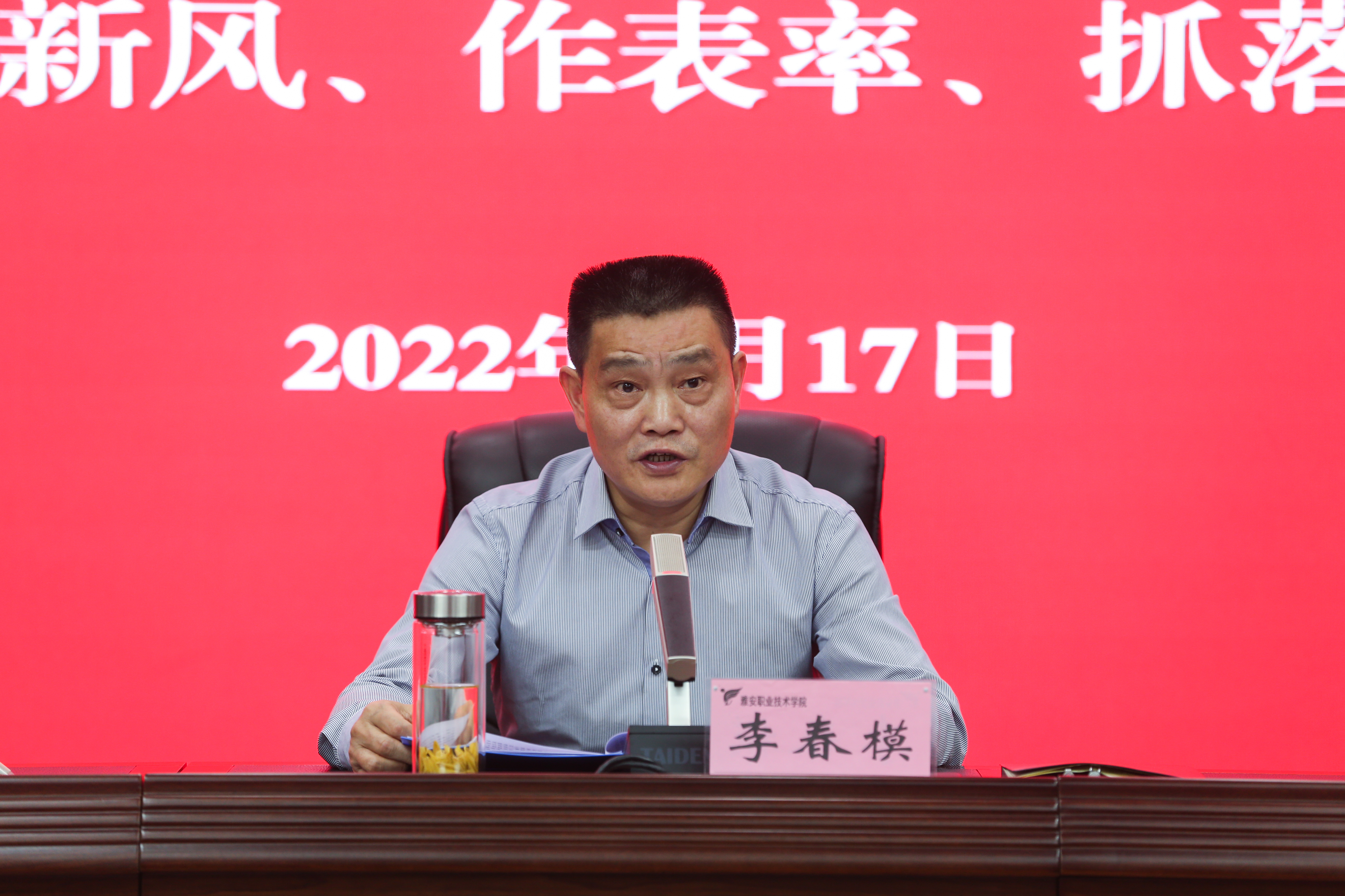 李春模指出,今年是党的二十大和省第十二次党代会召开之年,也是市委“工作落实年”。在这一特殊时间节点,开展“转作风、树新风、作表率、抓落实”专项行动作为开局大事,意义重大,这是对全市干部作风问题的一次全面整治,也是对我们学校作风的一次大排查。大家要把思想和行动统一到市委和学院党委决策部署上来,深入开展专项行动,持续巩固党史学习教育成果,为推进学院高质量发展提供坚强组织保障和纪律保障。