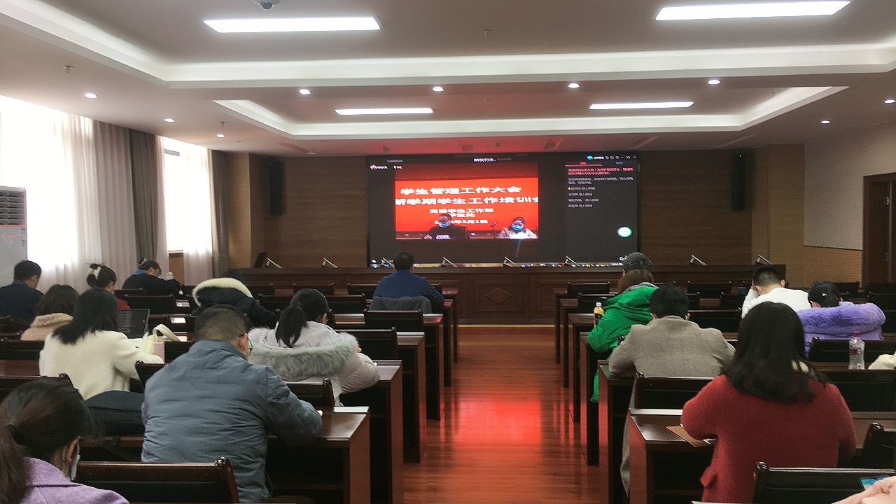 3月1日,学院召开学生管理工作会议暨新学期学生工作培训会,会议在青年路校区汇雅厅召开,经开校区综合楼311会议室设分会场。学院党委委员、副院长樊先茂,学生处负责人,各二级学院书记、副书记,防控办,辅导员、班主任、学生管理干事等共计70余人参加了会议。会议由学生处处长姚婕主持。
