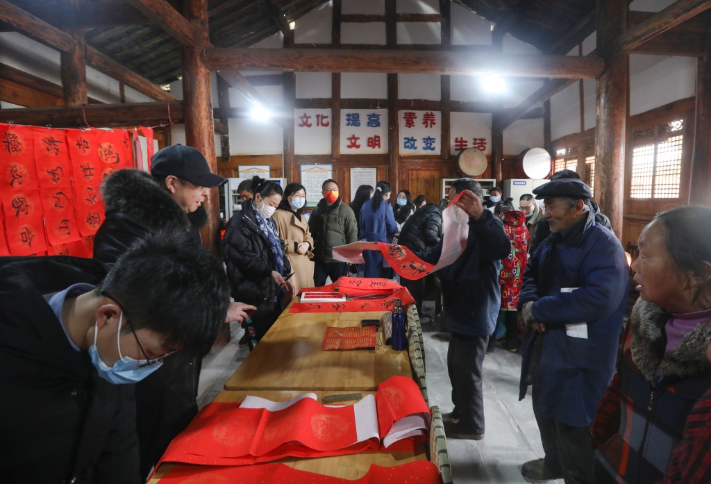 会后,李春模一行来到村医室外看望慰问村民和开展志愿服务的师生们。虽是冬寒料峭,但学校临床医学院、附属医院组织的医疗义诊服务点已有不少村民在问诊,医疗专家们耐心细致地为村民诊断、讲解,同时向村民们宣讲新冠疫情防控知识和要求。随后来到村文化活动室,气氛热烈而温馨,师范学院师生们正在忙碌地写着、剪着,一幅幅充满温暖的春联、一张张精美的窗花剪纸不时送到村民手中,让大家提前感受到新春的欢乐与祥和。当地村民激动地说,“你们对我们太好了!我都是来第3次了。给我们送来了专家,还给我们送来了新年的祝福,感谢学校对我们的帮助!”