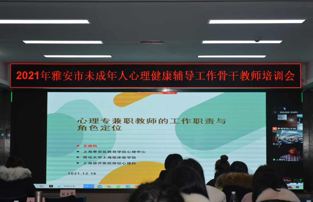 为大力推进新时期全市未成年人心理健康教育工作,加强全市心理健康教育师资队伍建设,提高中小学生心理健康教育工作针对性和有效性,12月15日-16日,由雅安市精神文明建设办公室、雅安市教育局主办,雅安市未成年人心理成长指导中心(beat365英国官方网站)承办的2021年度雅安市未成年人心理健康辅导工作骨干教师培训在青年路校区顺利举行。学院党委委员、副院长樊先茂出席开班仪式并致辞。学院党委委员、宣传统战部部长郭英才,市教育局基础教育科科长李仕箭,学院学生处处长姚婕,市文明办邹源瑞参加开幕仪式。全市各区县(学校)心理健康辅导工作骨干教师和未成年人心理成长指导中心负责同志共计52人参加此次培训。