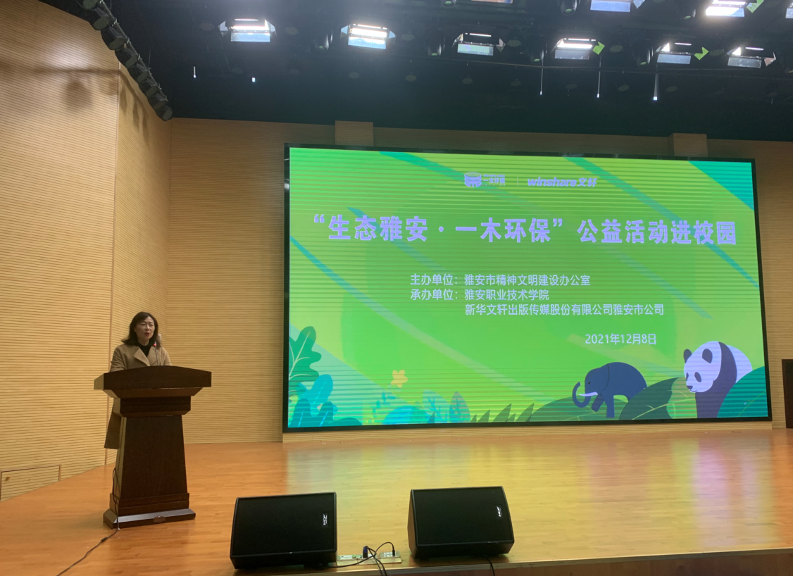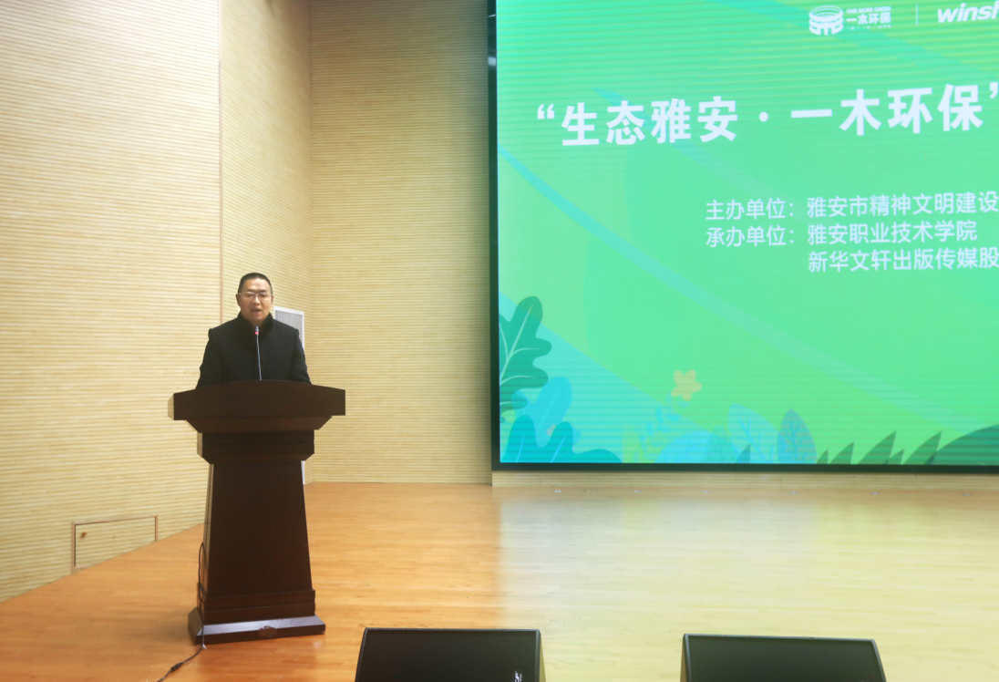 为深入培育和践行社会主义核心价值观,树立广大师生群体绿色低碳的环保意识,为建设富强民主文明和谐美丽雅安贡献力量,12月8日,学院联合新华文轩出版传媒股份有限公司雅安市公司在经开区校区聚雅厅举行“生态雅安•一木环保”公益行动进校园活动启动仪式。学院党委委员、纪委书记杨洪媛,雅安市精神文明建设办公室副主任唐世平出席启动仪式并讲话,学院党委委员、宣传部部长郭英才,新华文轩雅安市公司总经理陈柯参与仪式。学院团委、后勤处负责同志及师生代表90余人参加本次活动。