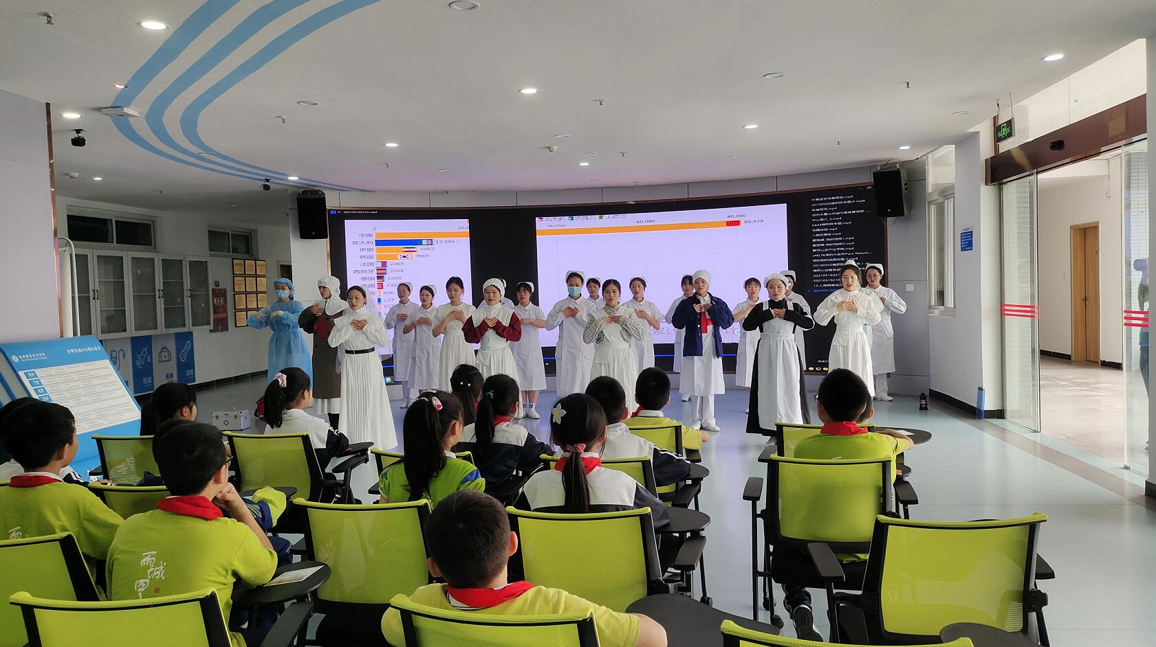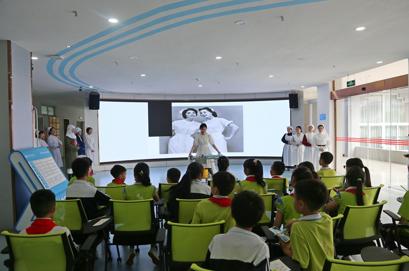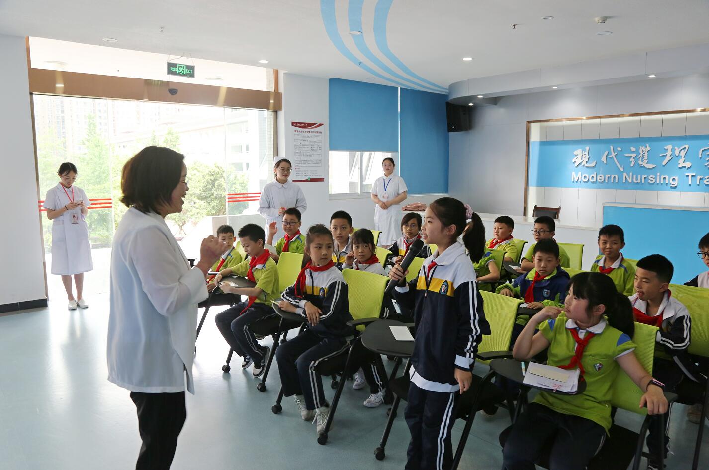 活动分为认识护理职业、授教心肺复苏、孕期胎儿发育讲解等三个部分。小学生们分成三组轮流进行闯关游戏,积极参与者获得小红章。通过观看视频、老师和学生示教、提问互动,闯关游戏等方式,寓教于乐,激发了小学生们的科普知识学习热情。