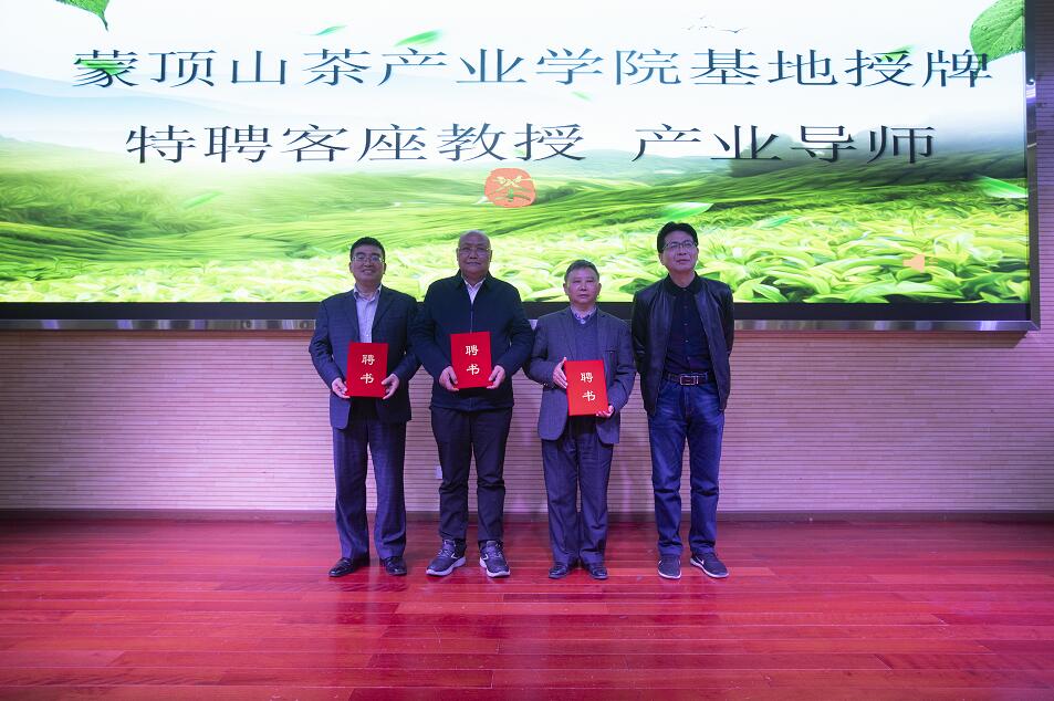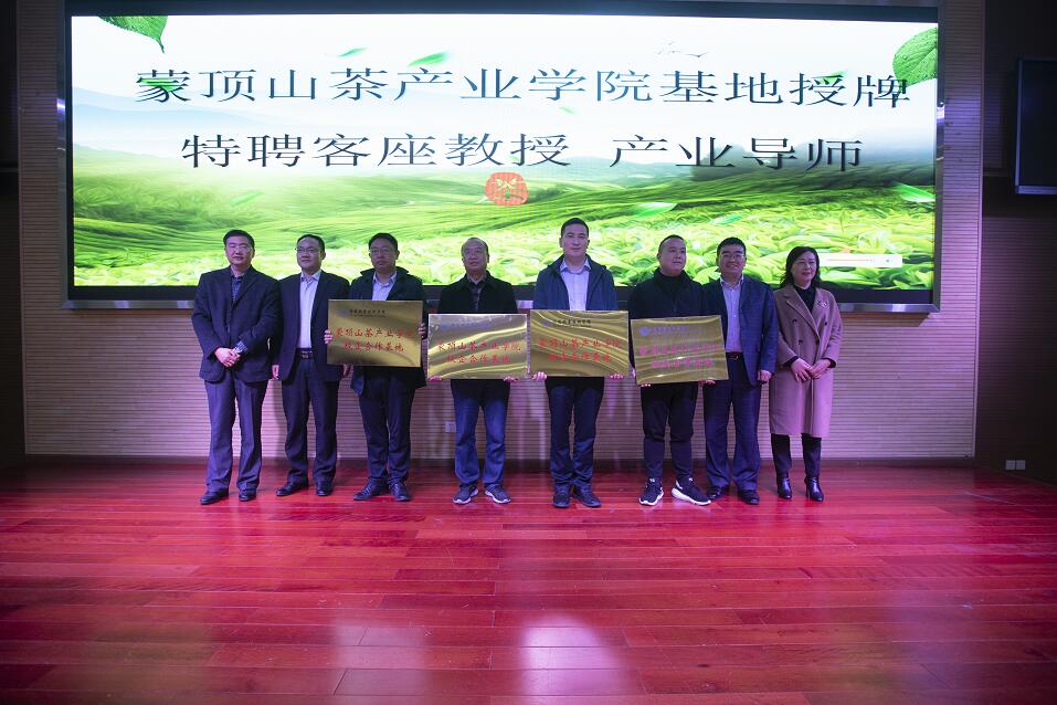 参会领导与行业专家代表共同为蒙顶山茶产业学院揭牌,并为校企合作基地发牌,为客座教授、产业导师颁发了聘书。