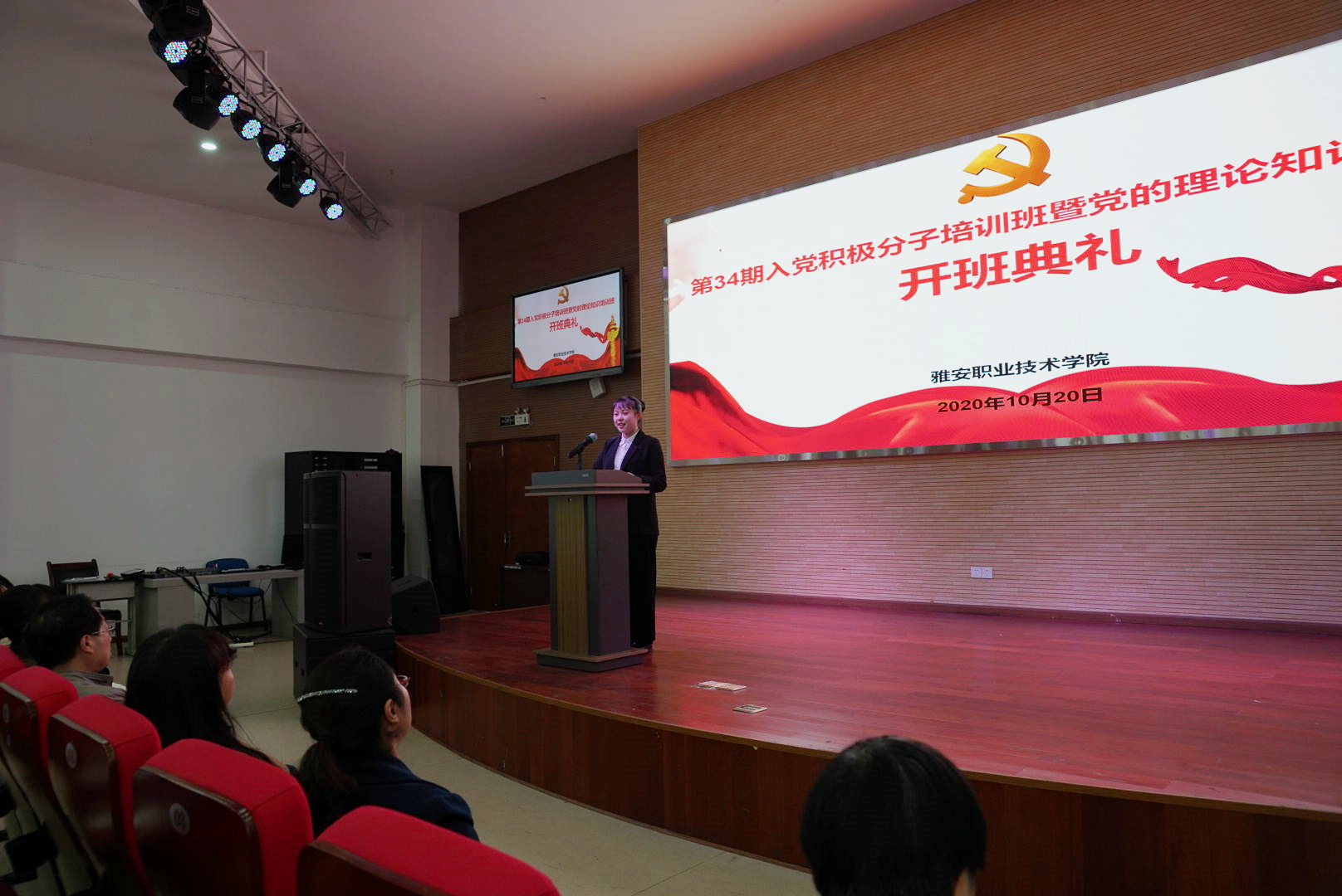 10月20日下午2点,学院党校第34期入党积极分子培训班暨党的理论知识培训班在青年路校区汇雅厅举行了开班典礼。结合我院学生分校区封闭管理的实际情况,考虑疫情防控的常态化需要,本次培训实施“线上、线下混合式”教学,确保云端学习不打烊,疫情防控不松懈,线上线下同频共振、同步发力。学院党委副书记付洪涛、各党总支(直属党支部)书记、党委组织部相关人员和82名青年路校区参训学员参加了线下开班典礼,132名经开区、育才路校区参训学员同步观看了线上直播。开班典礼由学院党委委员、组织部部长、人事处处长刘永恩主持。
