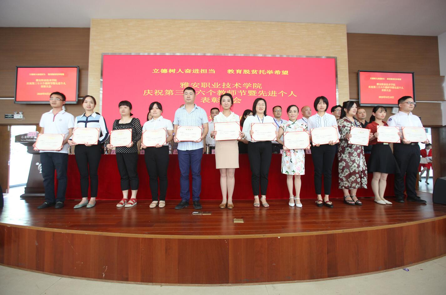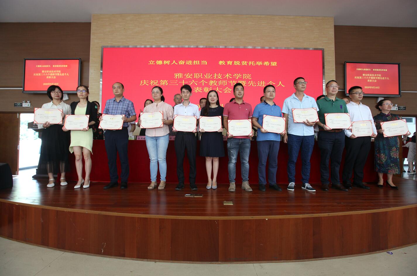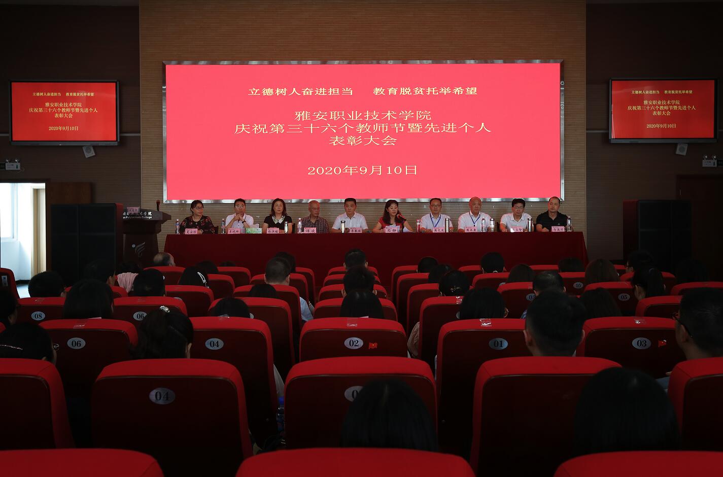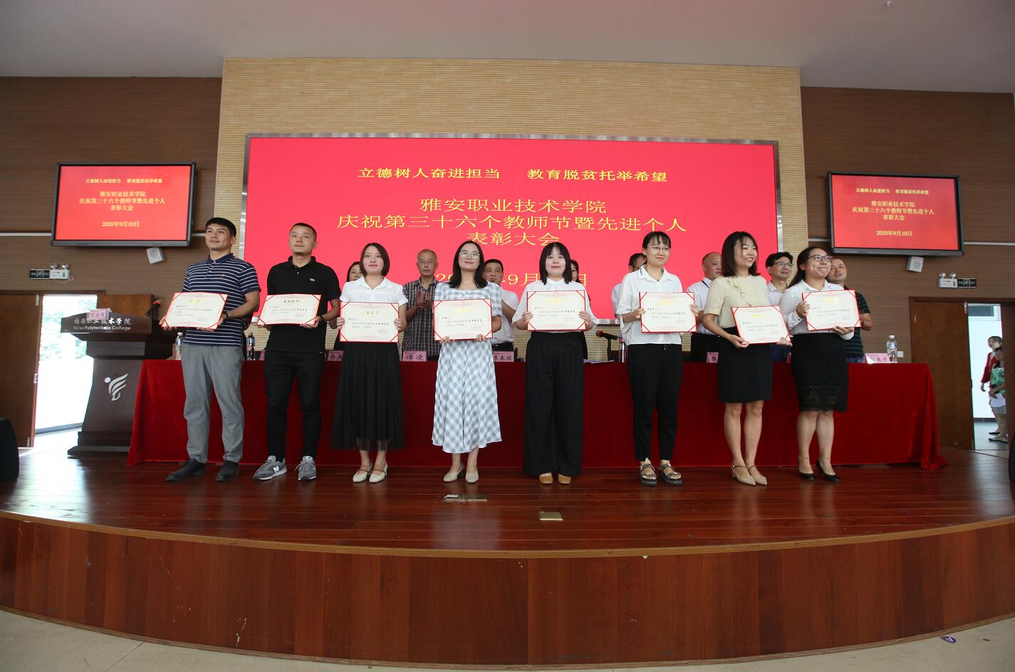 9月10日下午,在青年路校区实验实训楼多功能厅,学院召开主题为“立德树人奋进担当,教育脱贫托举希望”的庆祝第36个教师节暨先进个人表彰大会。学院党政班子成员、全体中层干部、受表彰优秀个人、2019年下半年至2020年新入职教师、部分在职教职工、离退休教师代表同聚一堂,共度自己的节日。庆祝大会由党委副书记、院长石静主持。