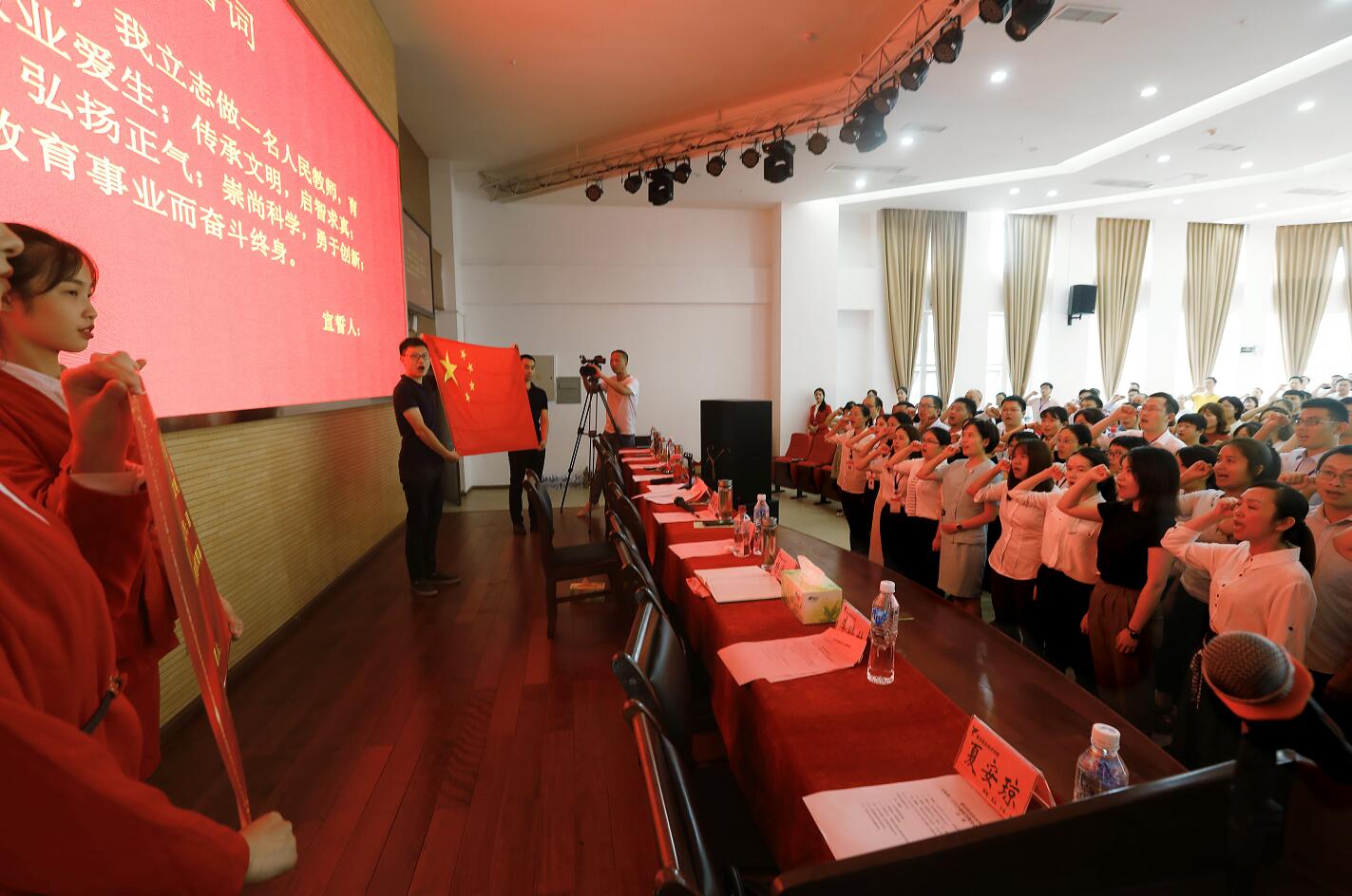 表彰大会在奏唱国歌声中拉开帷幕,在石静的带领下,28名新入职教师们整队进行了入职宣誓,其他教师重温了誓词。