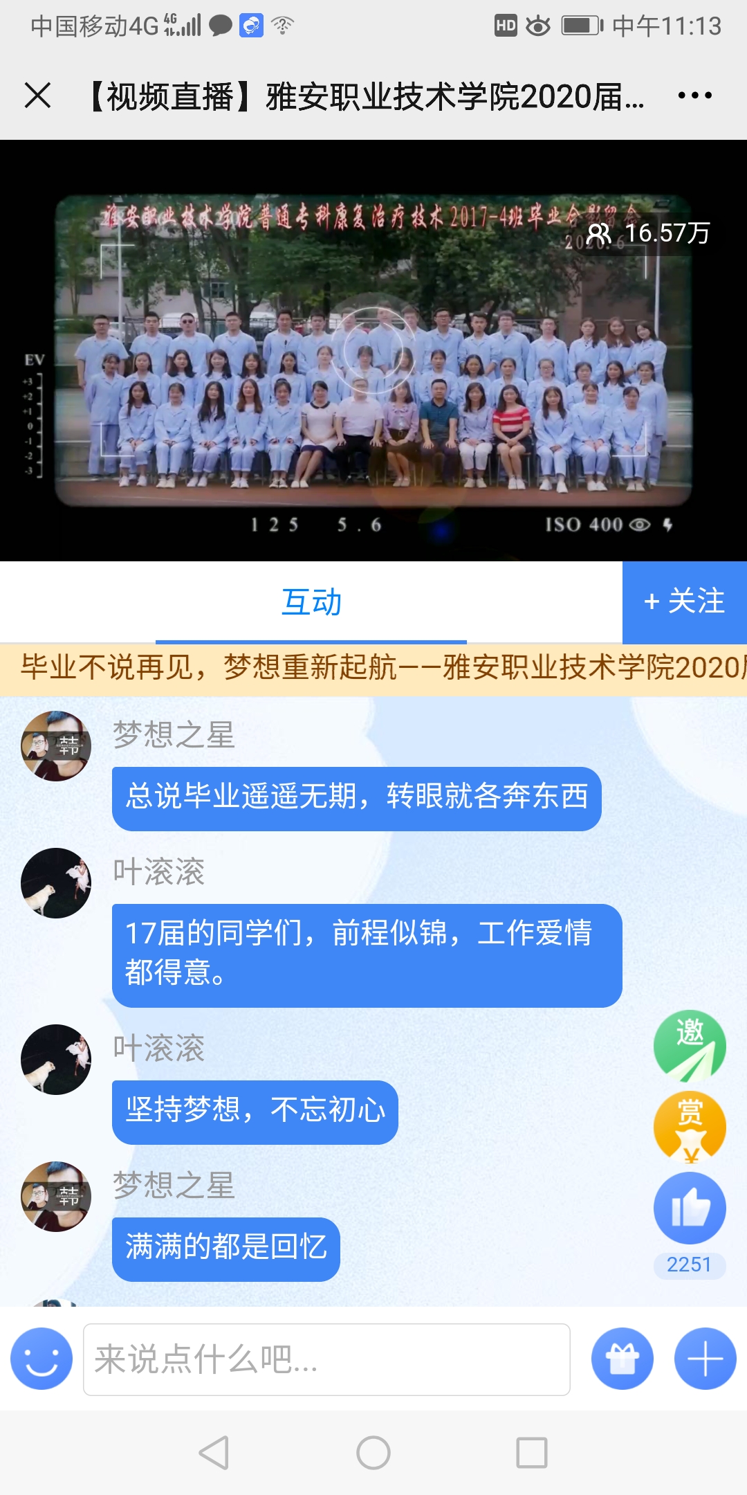 此次典礼中,12.66万人次通过天府直播平台线上观礼,并纷纷留言:“谢谢老师们!”“愿君此去前程似锦,归来时仍是少年。”“我们都记得,雅职芳华。”“听得好想哭啊,眼泪汪汪,又是一年毕业季。”“你们可爱纯真笑靥永远印在老师心中。”