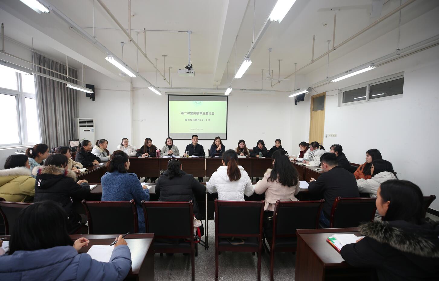 12月12日,结合“不忘初心、牢记使命”主题教育,学院党委书记李春模深入联系班级护理学院普通专科助产2019级1班参加了“解读第二课堂成绩单”主题班会,给同学们上了党课并与同学们座谈交流。学院党委委员、纪委书记杨洪媛,团委书记刘永恩,学生处副处长吕罗伊莎,护理学院党总支书记姚婕、副书记叶芋伶一同参加活动。班会由辅导员饶玲主持。