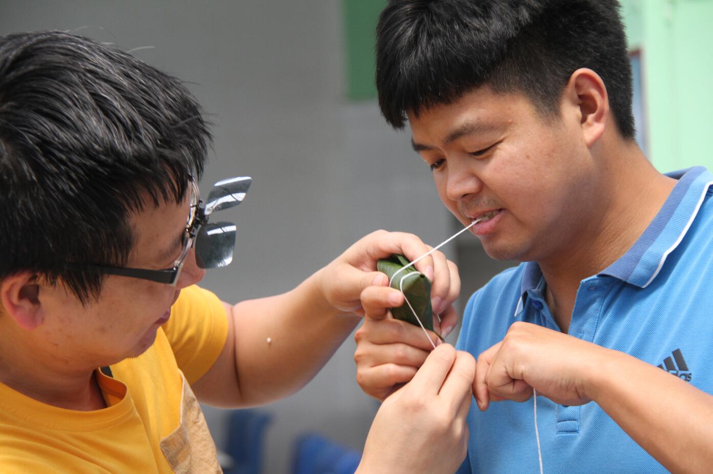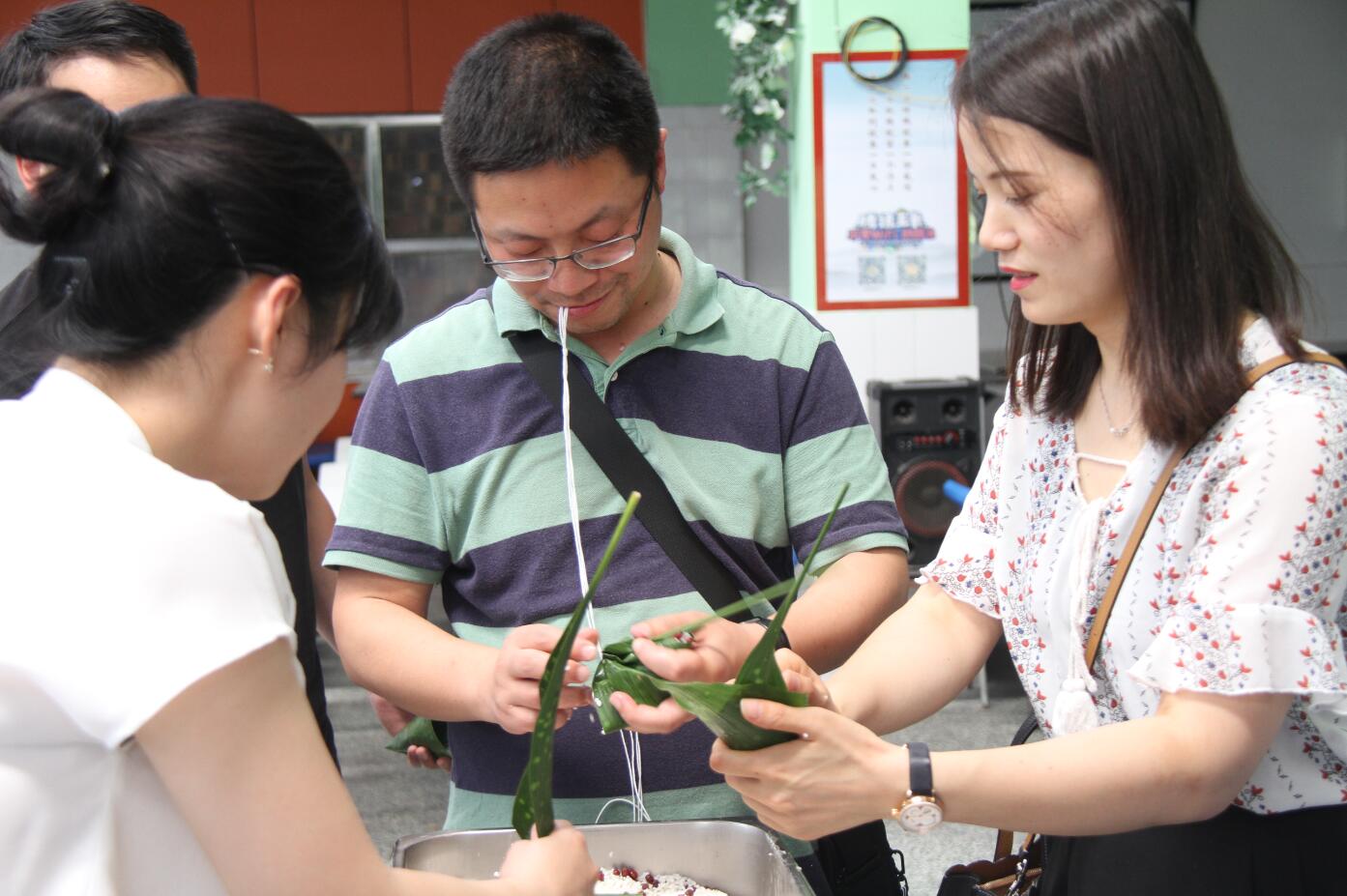 粽叶舞动、枣豆添米、麻绳穿梭,现场气氛温馨热闹,会熟练包棕子的老师们先进行示范,只见双手将粽子叶卷成漏斗状后,用糯米充实压紧,有技巧地折叠棕页,再用细绳打个结,动作娴熟、麻利优美,转眼间就包出了一个棱角分明的粽子,大家羡慕不已。随后这些指导老师 忙碌地不停穿梭于各组,耐心细致地给从来没有包过棕子的年青老师们进行手把手指导。不少老师是第一次包棕子,欠缺经验,边学边包,折粽叶、填糯米、封口、扎捆,虽然手法还不娴熟,动作也不连贯,但大家却做得格外认真,遇到问题,也都相互交流请教,大家在不断摸索和实践中逐渐掌握了包棕子的窍门,包起粽子来也有模有样了,只见托盘里一个、两个……包好的粽子越来越多。现场的气氛愉快而轻松,时不时传来老师们开心爽朗的笑声。看着自己亲自动手做出来的一个个粽子,大家表示:非常开心能够参与到这个活动中来,感受到了浓浓的节日气氛,非常具有仪式感和成就感。