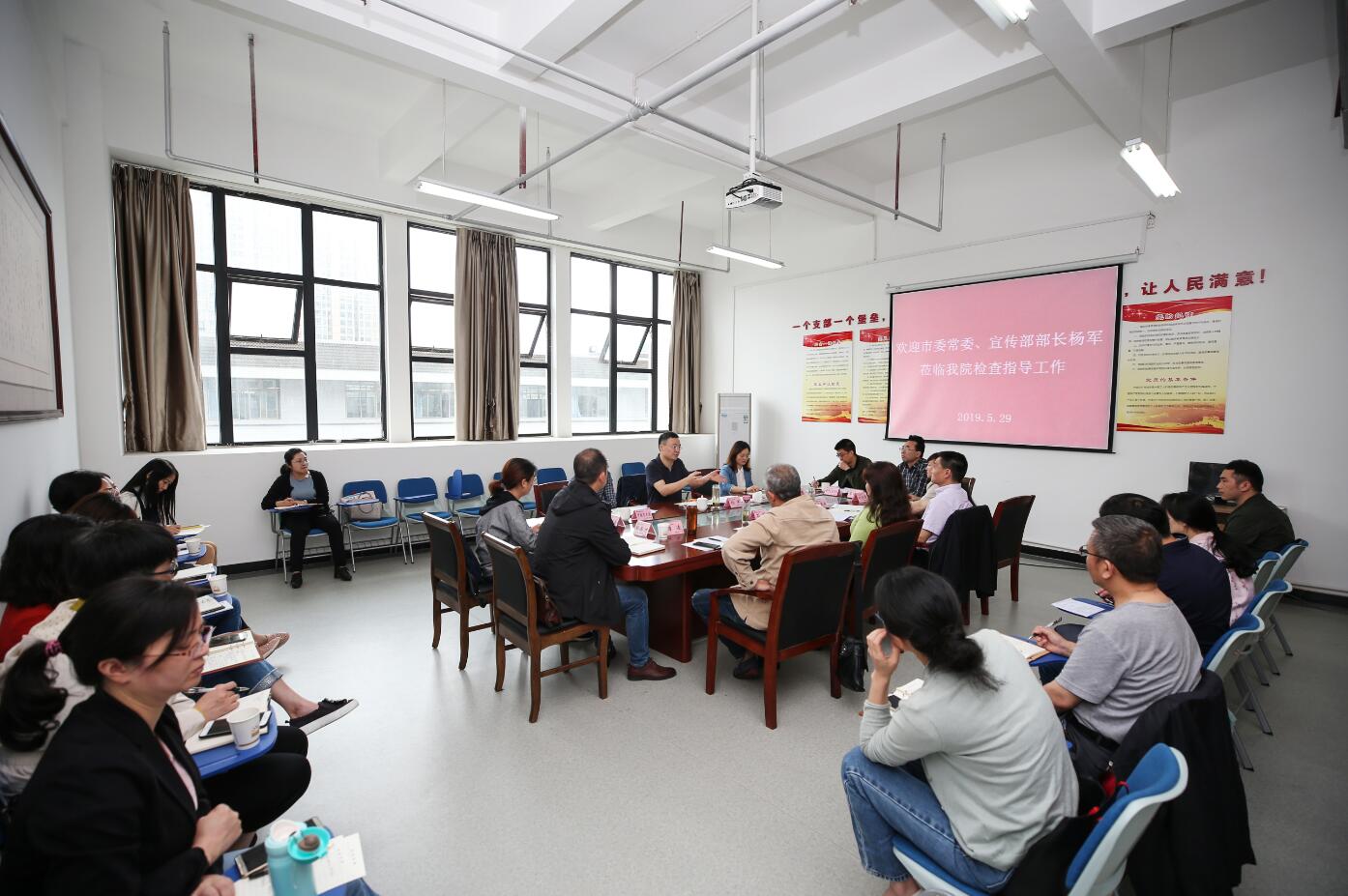 5月29日上午,市委常委、宣传部部长杨军来院调研督查指导工作,市委副秘书长刘雪黎、市教育工委专职副书记伍雅鸿、经开区管委会副主任易勇、市发改委市信息中心科长周毅陪同调研。学院党委书记李春模,党委副书记、院长石静等院领导、党委委员和相关部门负责人、各二级学院党总支(直属党支部)书记参加了调研座谈会。座谈会由李春模主持。