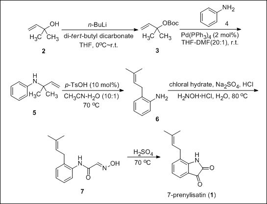具有重要生物活性的天然产物分子的合成研究一直是药物化学,合成化学领域研究的热点,为寻找先导药物提供重要来源。具有重要抗菌活性的天然活性分子7-prenylisatin于2015年荷兰莱顿大学科学家在菌素Streptomyces sp. MBT28中分离得到,关于该活性分子的合成研究鲜见报道。