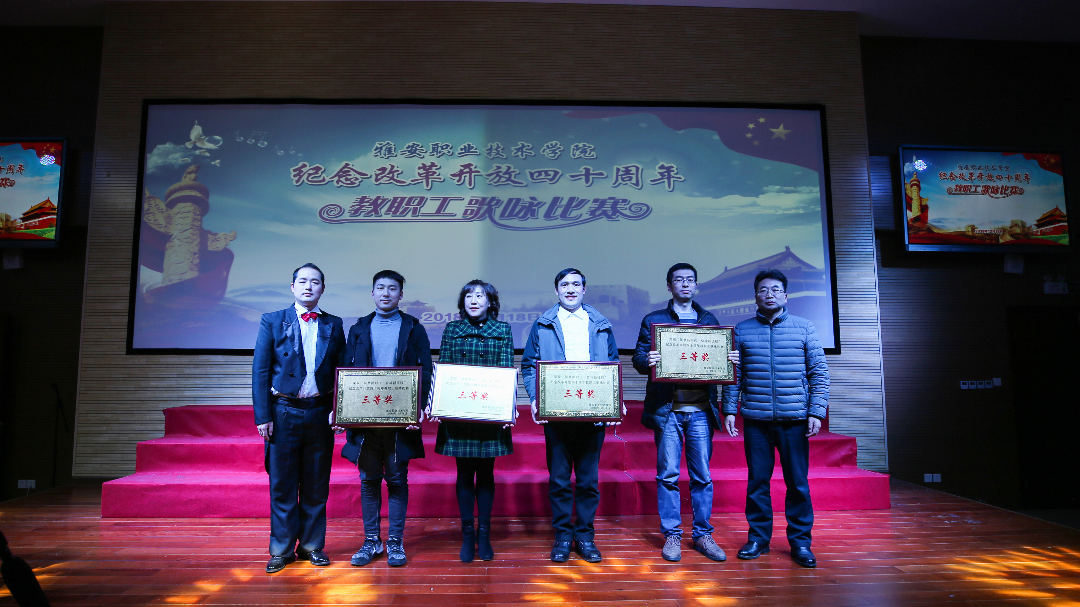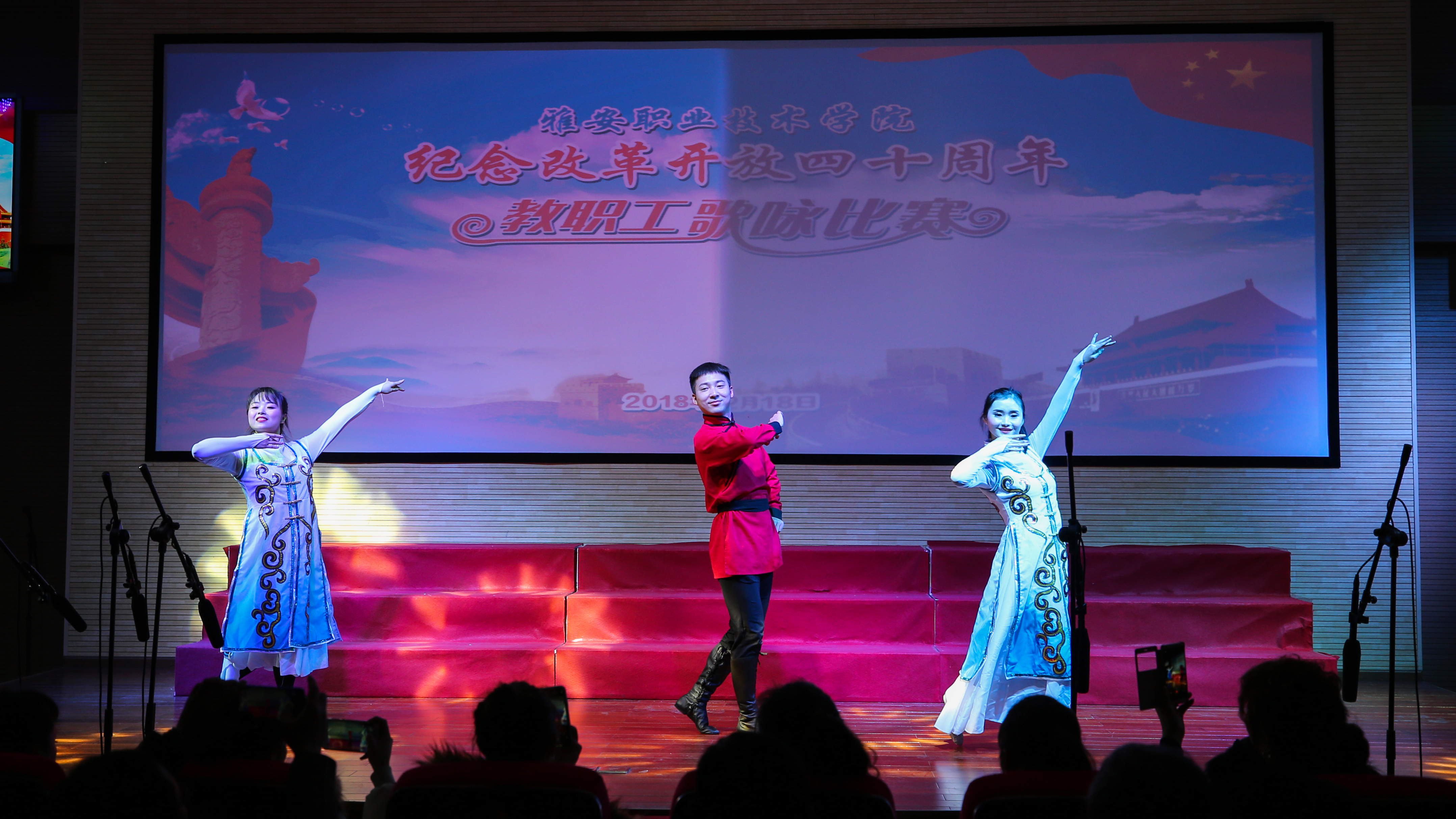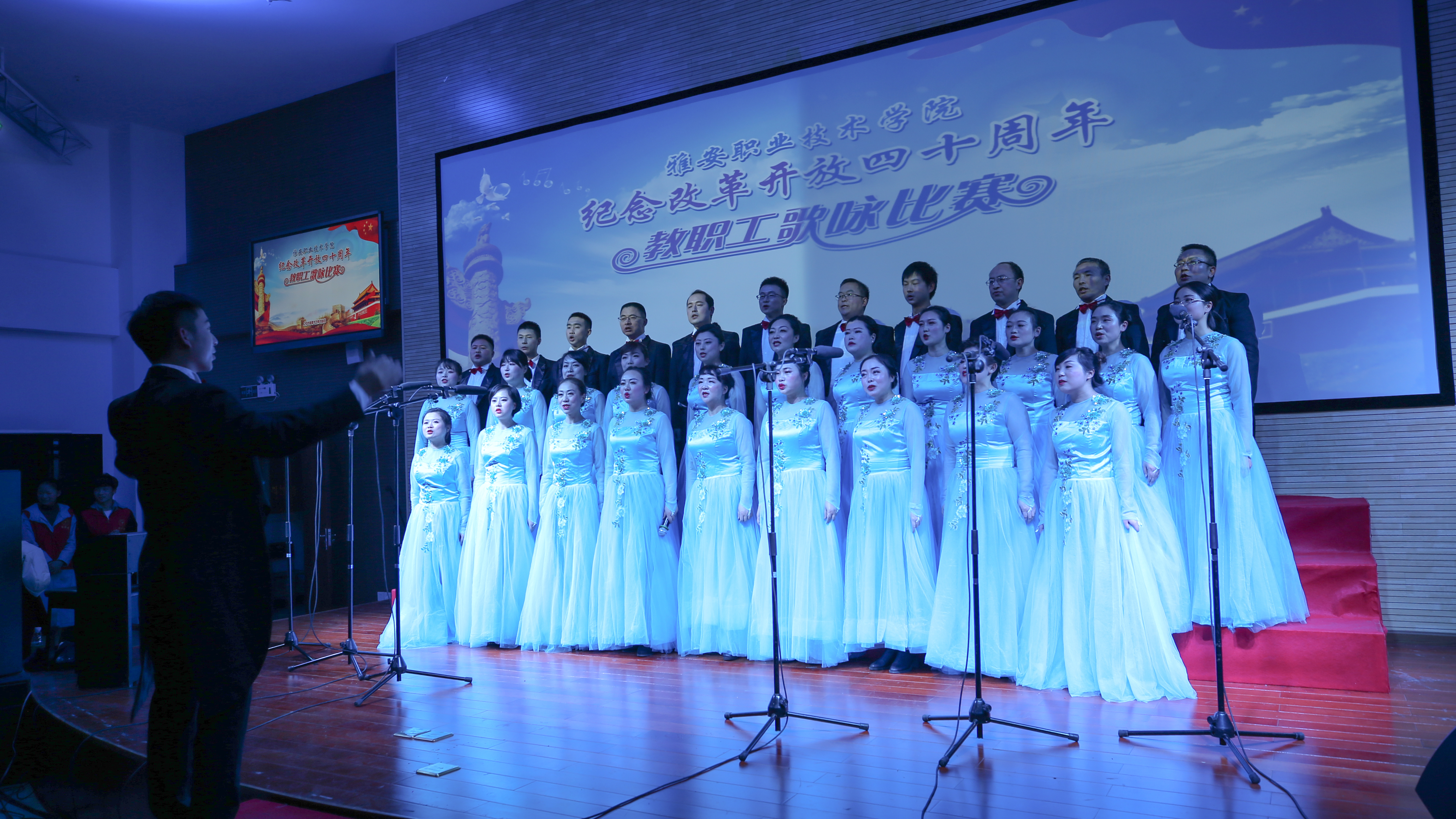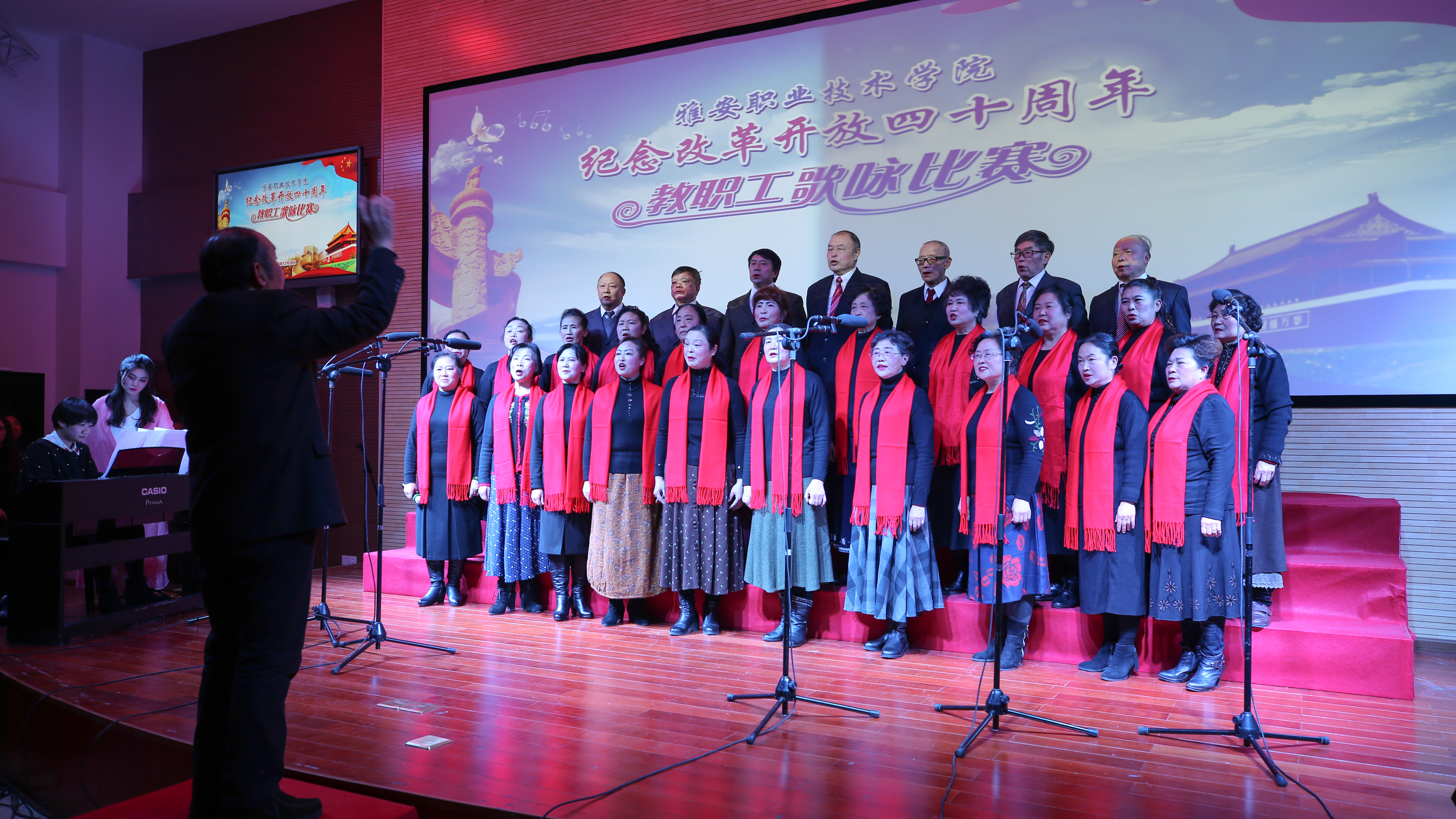 【本网讯】12月18日,beat365英国官方网站“筑梦新时代•奋斗新征程”庆祝改革开放四十周年教职工歌咏比赛在青年路校区实验实训楼二楼多功能厅隆重举行。学院党委书记李春模、院长石静等院领导莅临现场观看并参与演唱,各党总支、工会组成10支代表队、360余名教职工参加了演唱活动。比赛邀请了中国音协会员、四川省音协理事、雅安市音协主席李宣康,中国音协会员、四川省音协理事、雅安市音协副主席吕志健等5位专家担任评委。