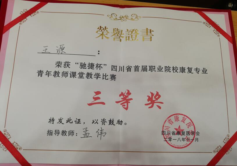 【本网讯】2018年11月23日,我院康复治疗技术专业教师王源参加了四川省首届职业院校青年教师课堂教学比赛,并获得三等奖,孟伟老师获得优秀指导教师奖。