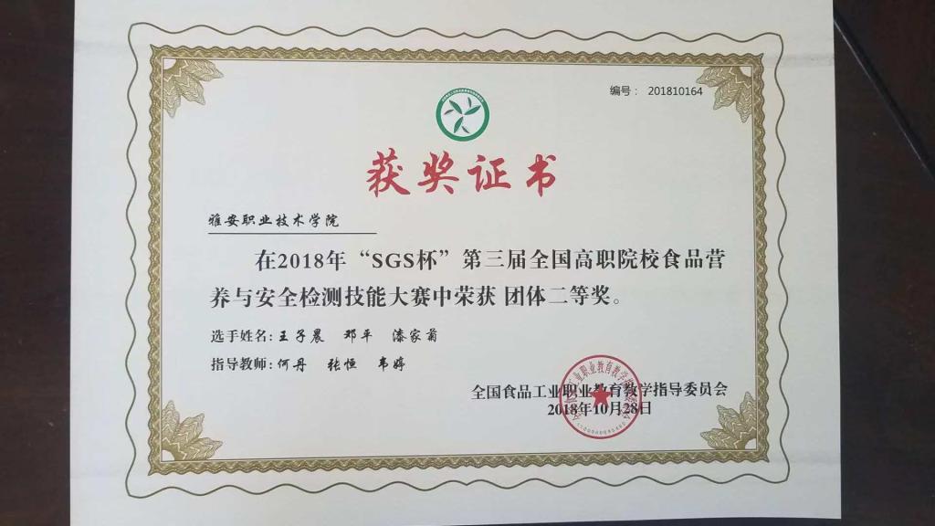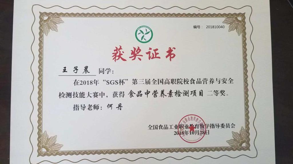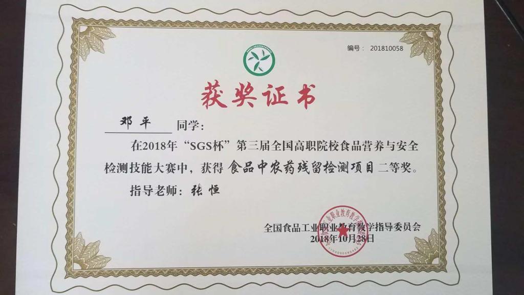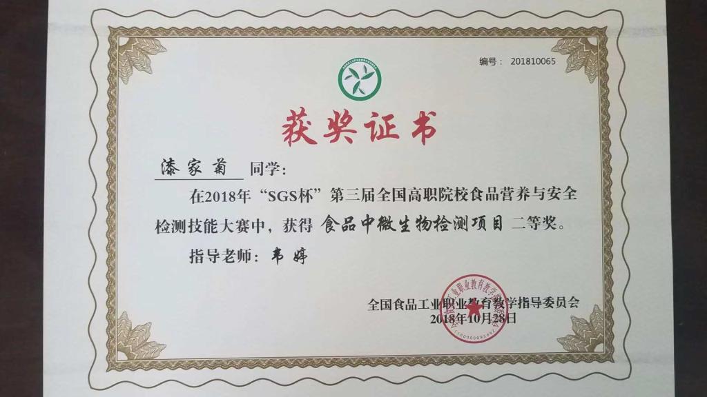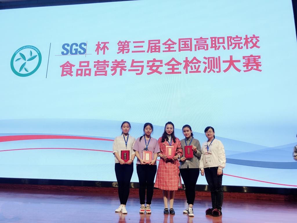 【本网讯】近日,由全国食品工业职业教育教学指导委员会主办的SGS杯第三届全国食品营养与安全检测高职院校在校生技能大赛,在广东轻工职业技术学院举行。药检学院食品营养与检测2016-1班王子晨、漆家菊、邓平同学分别获得营养素检测、微生物检测、农药残留检测三个单项二等奖,并喜获团体二等奖。