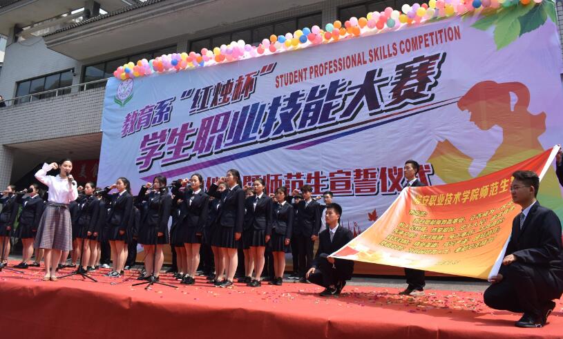 【本网讯】4月17日下午,教育系在青年路校区举办了第一届“红烛杯”学生职业技能大赛启动仪式暨师范生宣誓仪式。学生处处长王伟才,各系团总支书记,教育系党政负责人、各教研室主任及部分专业教师到场参加活动,教育系2017级全体学生举行了师范生宣誓仪式。