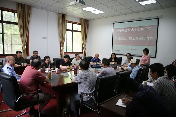 【本网讯】为了协助学院抓好对学生的法治安全教育,帮助青少年健康发展、成长成才, 5月5日上午,学院关工委邀请市关工委法制宣讲团来院指导工作,在育才路办公楼B211会议室组织召开了思想政治、安全稳定工作座谈会。学院关工委执行主任李安,副主任陈顺贵、张敬春,雅安市关工委法治宣讲团团长郑有庆、副团长刘全金,雅安市禁毒大队教导员文晓燕、雨城区青江派出所副所长张昌煌、院关工委校校纪校风安全稳定督导组全体成员和学生处、保卫处、团委负责人参加了座谈会,大家共商面对青年学子的预防犯罪、远离毒品、增强法治意识办法和措施。会议由李安主持。