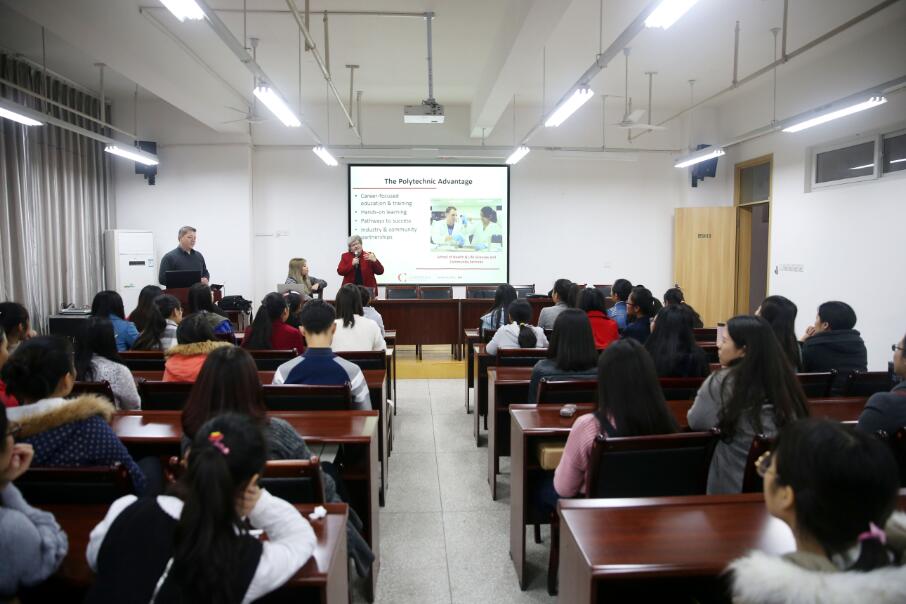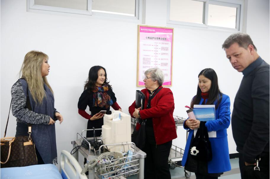 交流过后,Marlene女士一行参观了护理实训中心,并对学院部分在校学生进行了关于国外护士工作现状及护士职业生涯规划的专题讲座。
