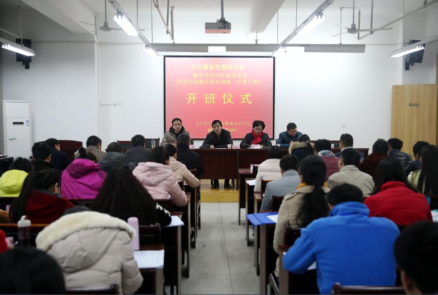 【本网讯】12月14日,受中共雅安市委组织部委托,雅安2015年基层党员信息化技能示范培训班(总第五期)在我院开班。本期培训为期5天,由学院院成人教育与培训处与机电系联合承办。本期培训班将重点学习党的理论政策、计算机网络基础管理与维护、互联网+产品营销、现代办公应用软件、微信公众平台推广与维护、图像处理等方面的知识与技能。共有来自六县两区和经开区的100余名学员参加了开班仪式,全体党员重温了入党誓词。