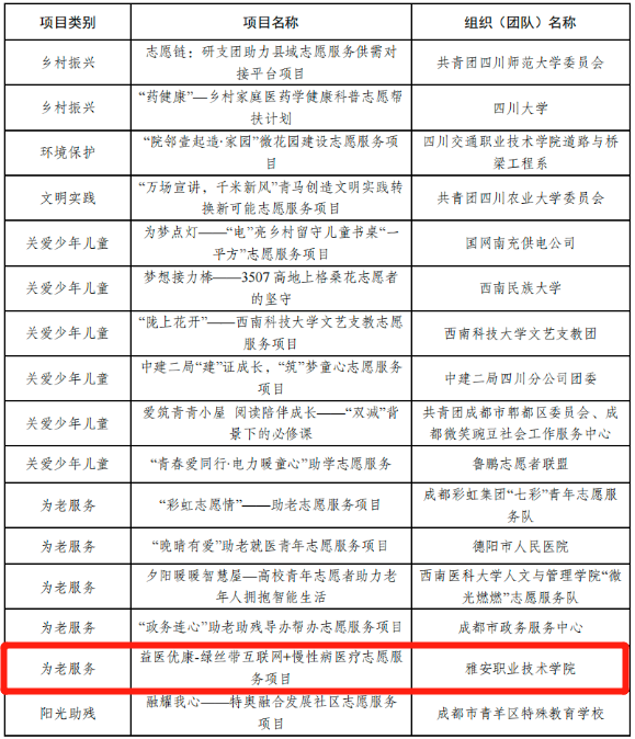 9月23日,第六届中国青年志愿服务项目大赛四川省赛获奖名单公布。我院临床医学院“益医优康-绿丝带互联网+慢性病医疗志愿服务项目”荣获为老服务类金奖。院团委“科伴童行-乡村学龄前儿童科普启蒙推广计划”荣获关爱少年儿童类铜奖,并代表四川省参加第六届中国青年志愿服务项目全国赛。