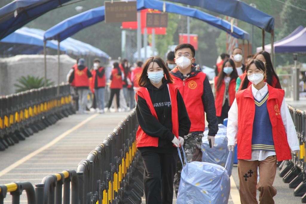教师志愿者们在校门口负责指导协助学生完成进校核验流程以及维持进校通道畅通。在这里能感受到依依不舍的离别情,也能体会到青春昂扬的凌云志。“孩子们,排好队不着急”、“孩子,这个推车上是你的行李,跟着我走”,“家长您放心,我们一定会照顾好你们的孩子”……志愿者老师们在迎新志愿服务的过程中一遍又一遍的重复着这些话语。