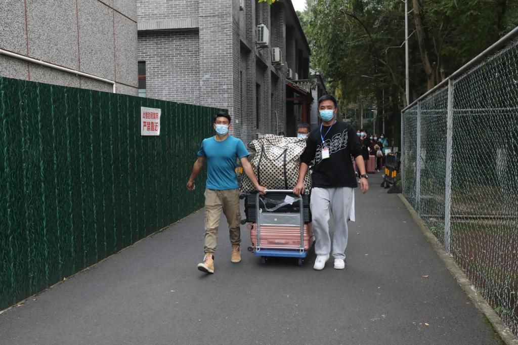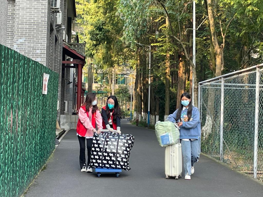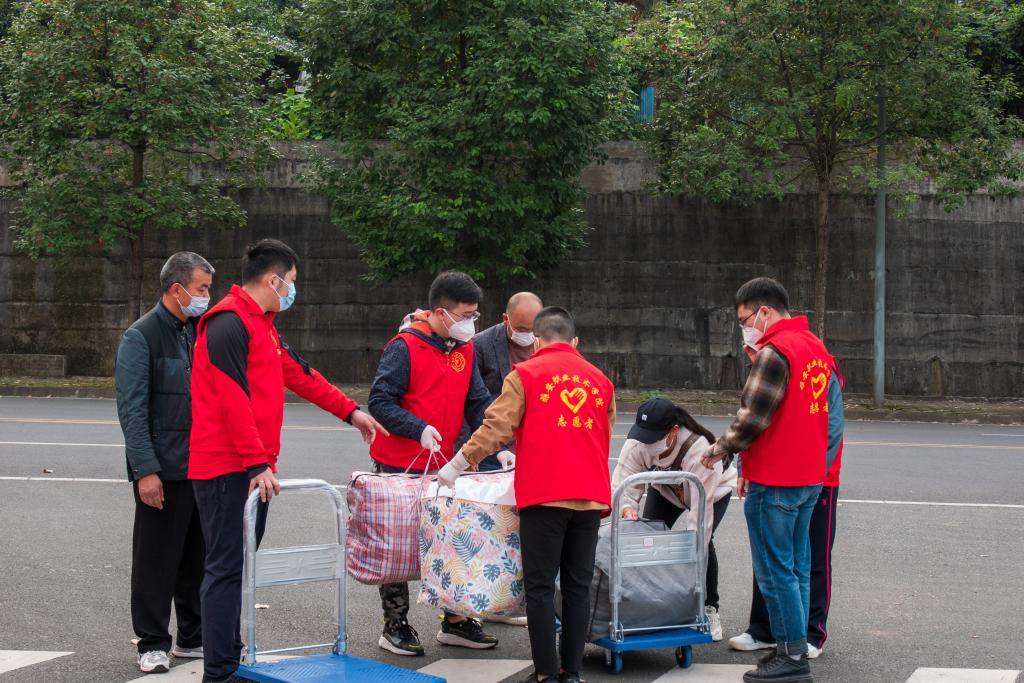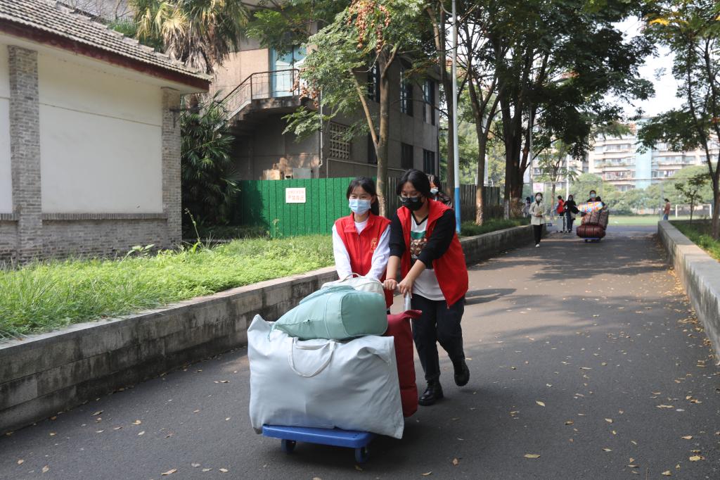 人手不足,包裹突增。为了更好地完成迎新工作,学院在育才路校区召集了青年志愿者协助运输、分发行李。青年志愿者为新生返校工作增添了一抹青春亮色。