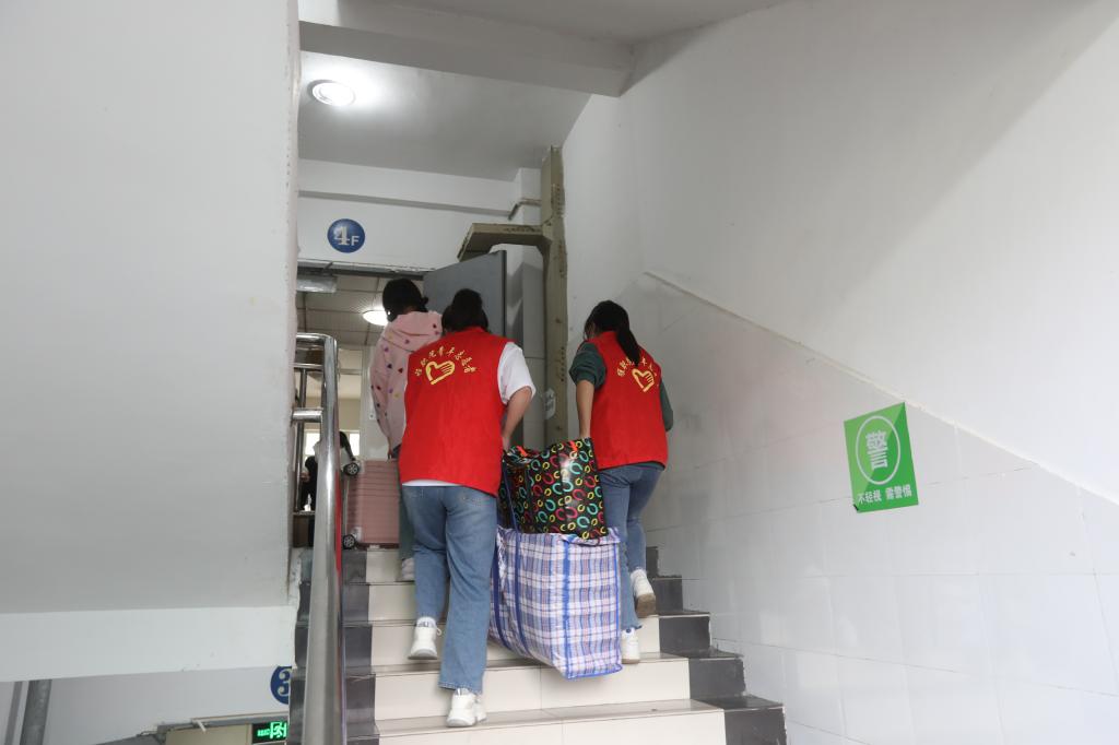 团委教师刘舰桥在验码区和宿舍楼下这条路上来回奔波,她主要负责指导学生到对应区域办理寝室入住登记手续,协助学生将大件行李搬运上楼。面对沉重繁多的行李,她被淹没在“行李海”,不停地弯腰起身,“大家先去学院报到,行李放在这里不担心”,“这堆是你的,那堆是你的,慢点拿注意安全”……