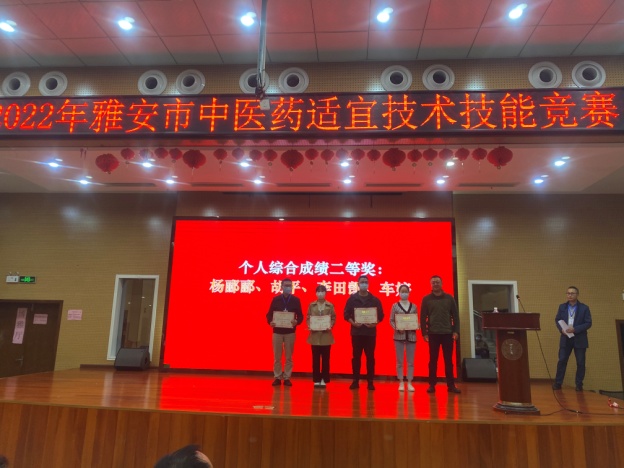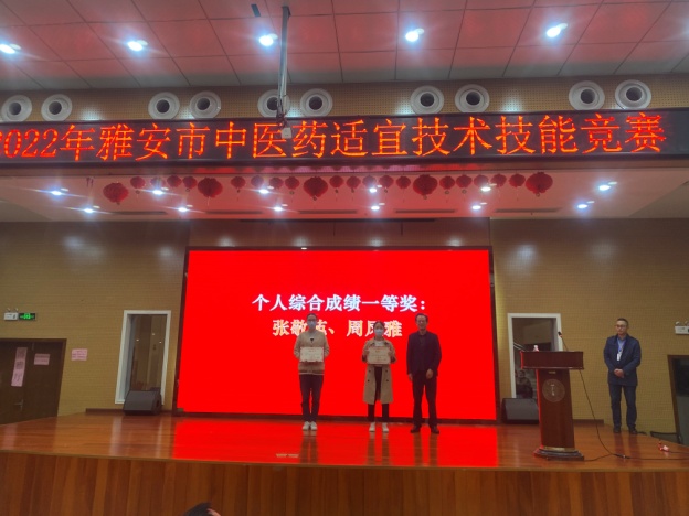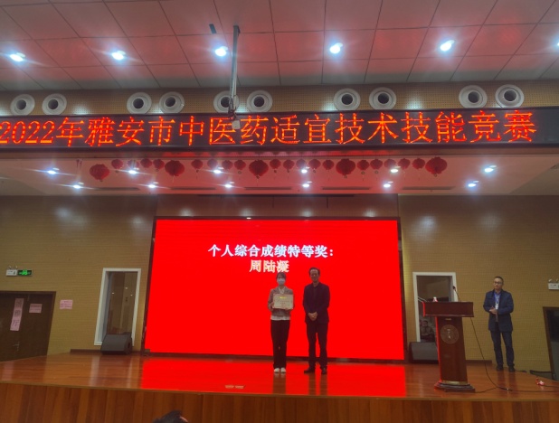 雅安市基层中医药适宜技术技能竞赛是对全市中医药人才队伍、中医药服务能力建设的一次全面检阅。赛前,医院领导高度重视,统筹谋划,做好各方面协调准备工作,会同中医骨伤•康复医学科主任周陆凝制订详细参赛方案并高标准选拔参赛队员。比赛过程中参赛选手们沉着冷静,规范操作,展现了娴熟的中医诊疗技术和良好的竞技风貌,经过激烈的角逐,我院荣获团体一等奖,参赛选手周陆凝荣获个人综合成绩特等奖,张敬苑荣获个人综合成绩一等奖,杨郦郦、胡平荣获个人综合成绩二等奖佳绩。