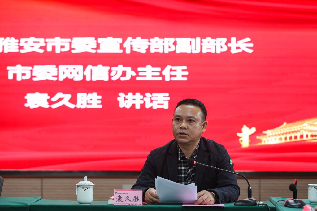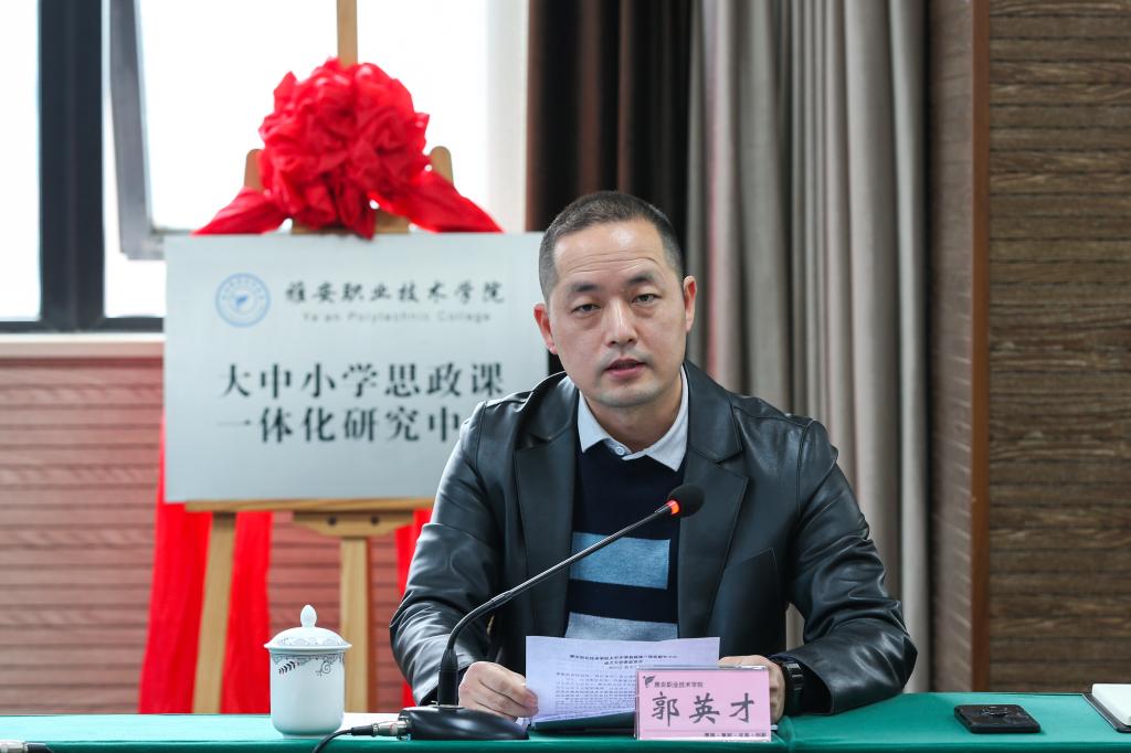 为深入贯彻落实习近平新时代中国特色社会主义思想和习近平总书记关于“大思政课”的重要指示批示精神,进一步推进我市大中小学思想政治教育一体化建设工作,11月14日下午,学院大中小学思政课一体化研究中心(后文简称“研究中心”)成立大会在青年路校区举行。中共雅安市委宣传部副部长、市委网信办主任袁久胜,雅安市委教育工委委员,雅安市教育局党组成员、副局长杨松,学院党委副书记付洪涛,以及雅安市教育科学研究院基教所,雅安中学、雅安市雨城区实验小学、雅安市雨城区兴贤小学、雅安市雨城区四小、雅安市外国语实验小学等成员单位的领导与教师代表,学院相关部门负责人、马克思主义学院教师代表参加成立大会。马克思主义学院直属党支部书记、院长郭英才主持会议。