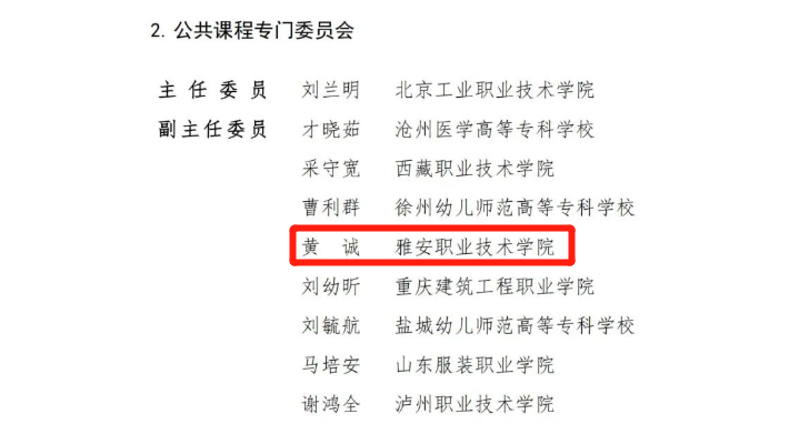 学院党委副书记、院长黄诚入选教育部职业院校教育类专业教学指导委员会公共课程专门委员会副主任委员。