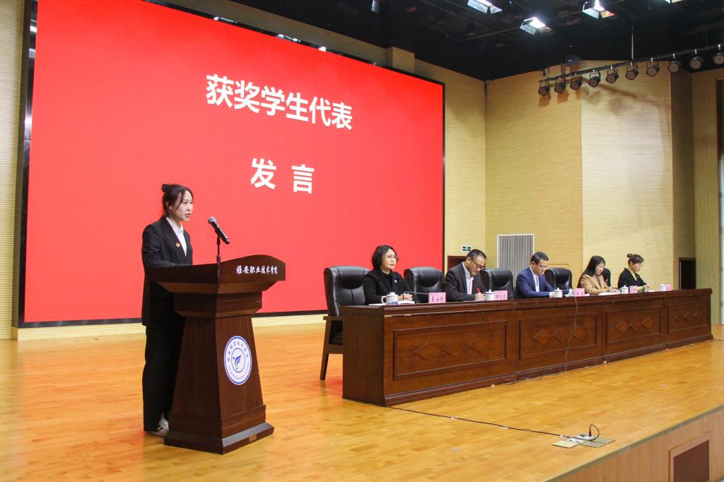 会上,获得国家奖学金的学生代表李佳秀发言,讲述了自己坚持不懈,砥砺前行,用汗水和睿智抒写青春的榜样故事,充分展示了新时代雅职学子的敢闯敢拼、善作善成,奋勇争先的优秀品质。