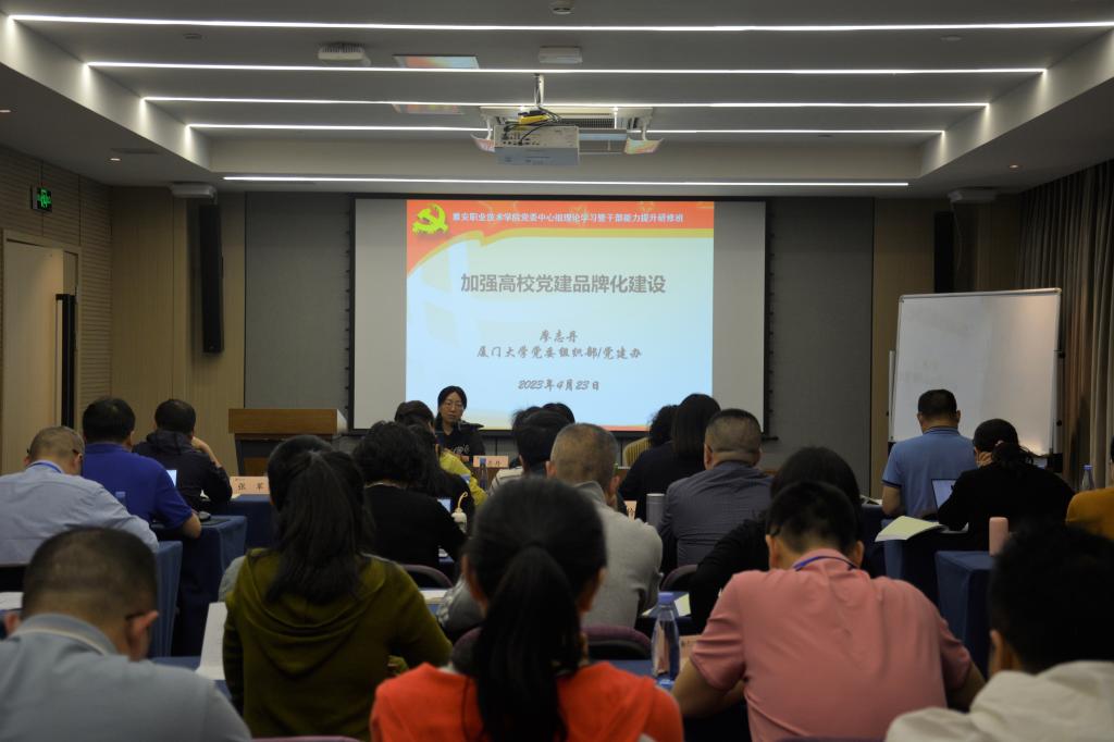晚上,厦门大学党委党建办主任、组织部副部长、教师工作部副部长廖志丹作《加强高校党建品牌化建设》主题报告,围绕“什么是党建品牌”“他山之石”“高校党建品牌是怎样形成的”三方面进行讲授,并结合相关案例进行了分析,为学院党建品牌建设提供了方向思路。