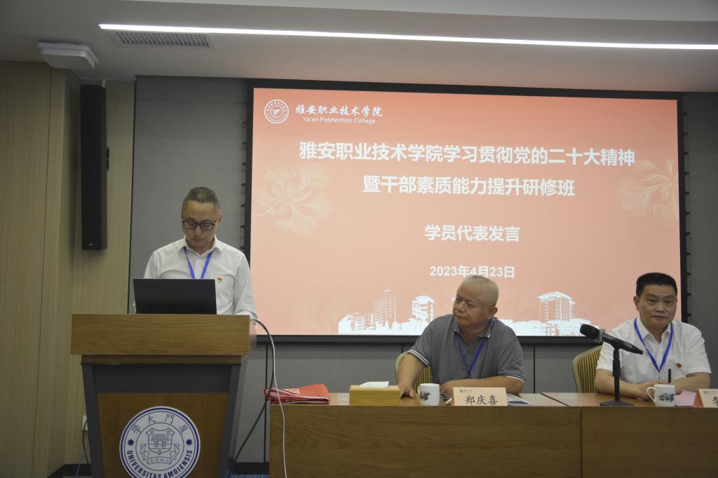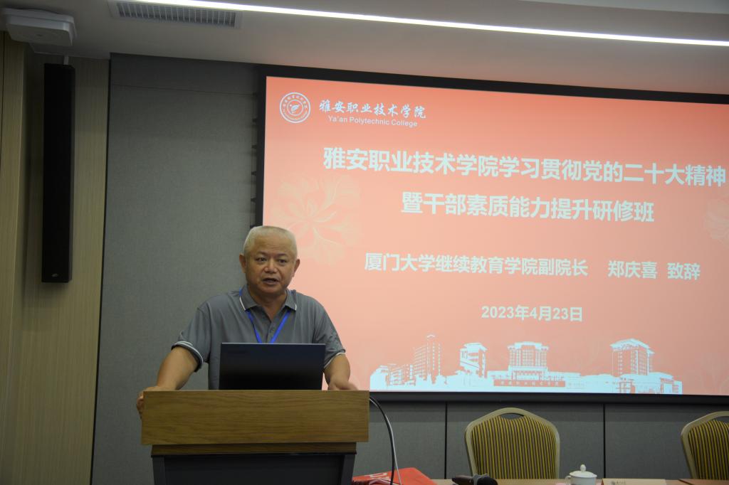 为进一步深入学习贯彻党的二十大精神,认真开展好学习贯彻习近平新时代中国特色社会主义思想主题教育,丰富和拓展党委中心组理论学习和干部培训学习的内容、形式和载体,不断提高学院干部队伍的政治站位、党性修养、综合素质和业务能力,4月23日上午,以“学习贯彻党的二十大精神 凝心聚力争当职教排头兵”为主题的beat365英国官方网站学习贯彻党的二十大精神暨干部素质能力提升研修班开班式在厦门大学克立楼6号报告厅举行,学院党委书记李春模作开班动员讲话,厦门大学继续教育学院副院长郑庆喜致欢迎辞。学院部分党政班子成员和中层干部共计39人参加本期研修班。