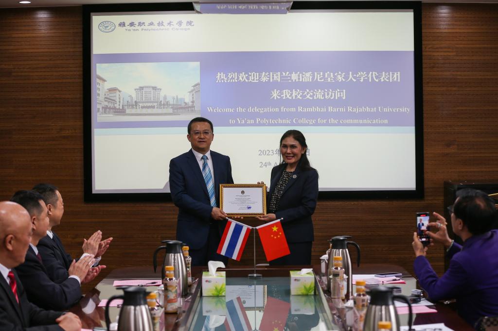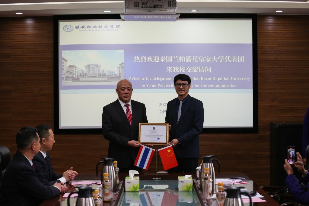4月24日,泰国兰帕潘尼皇家大学副校长比雅楠•诗提金达(Preeyanan Sittijinda)一行9人来学院进行交流访问,在经开区校区综合楼303会议室召开洽谈会并签订校际合作备忘录。学院党委副书记、院长黄诚,党委委员、副院长樊正康,雅安市经济合作和外事局、雅安市侨联和学院相关二级单位负责人参加此次会议,会议由樊正康主持。