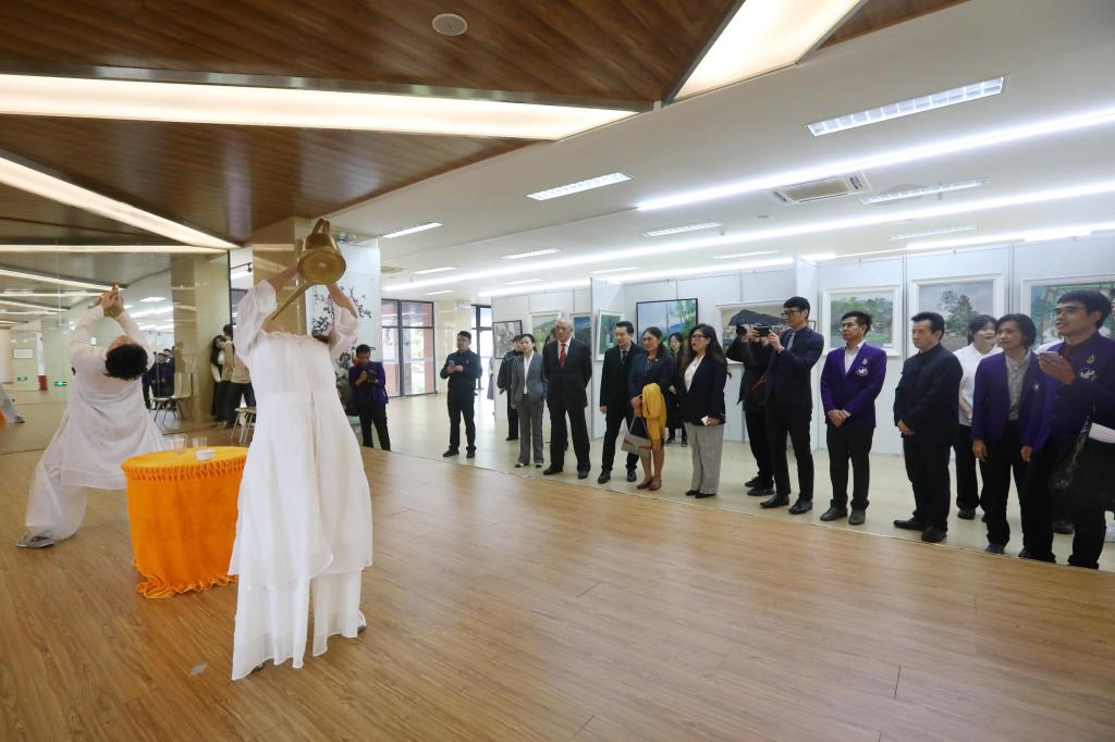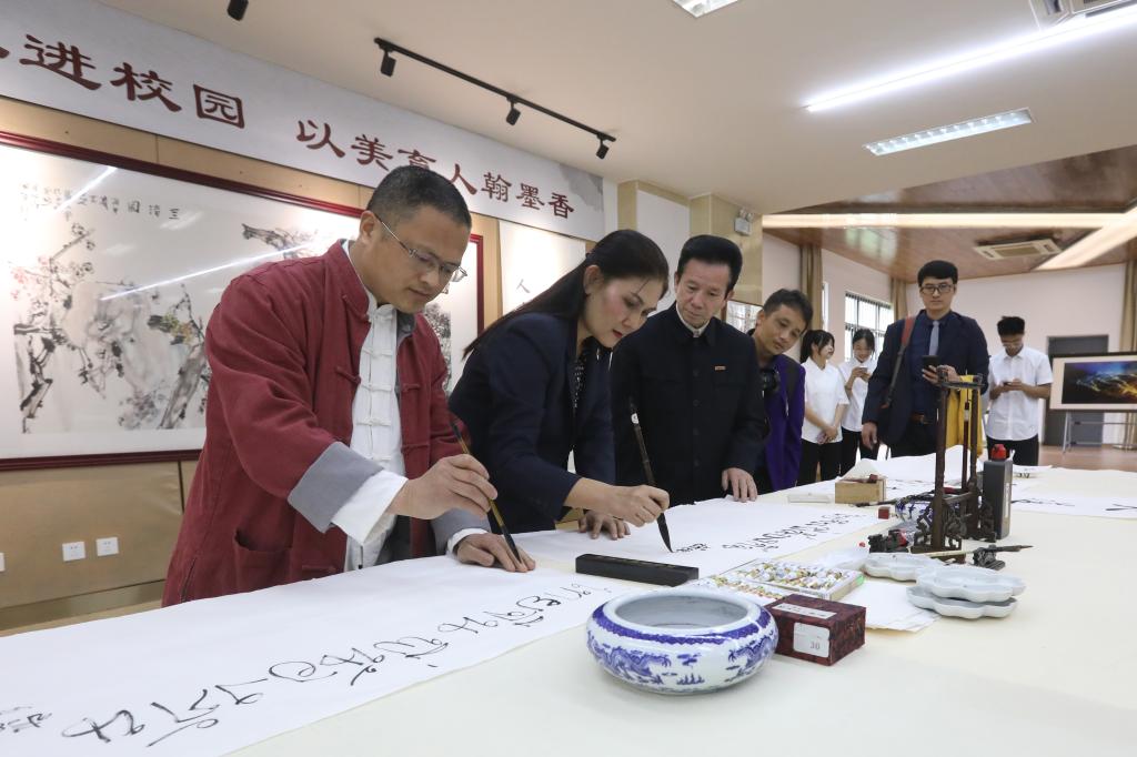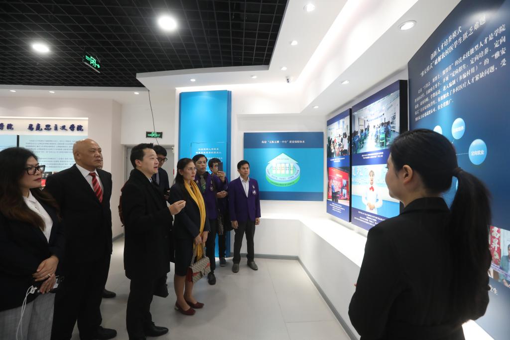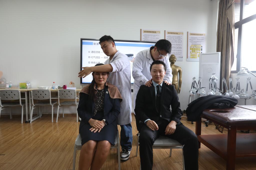 诗提金达一行参访了学院校史馆、中国书画展示馆、临床医学院、中医与康复养生学院、药学与检验学院,现场观摩了中国书画和长嘴壶茶艺展示并体验了中国书法、中医药文化、针灸推拿文化。