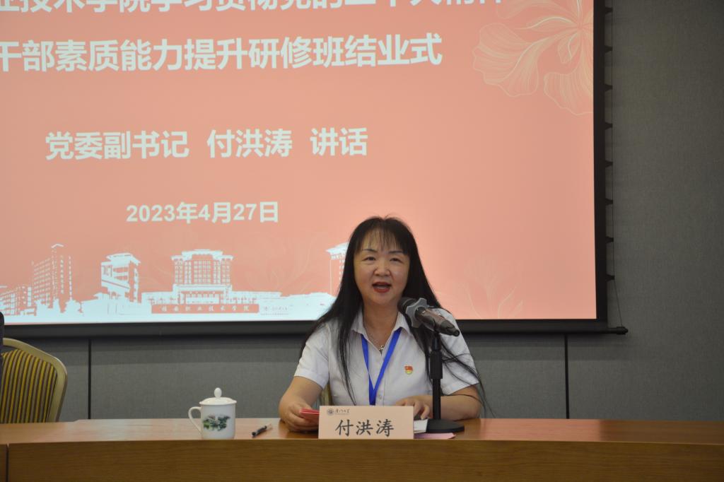 付洪涛在总结讲话中代表学院党委向所有授课专家及厦门大学继续教育学院为本期培训班所作的精心周密安排表示衷心感谢,也向全体学员圆满完成学习任务达到预期目的和效果表示祝贺。并就持续推动党的二十大精神贯彻落实到学校党的建设、教育教学各方面、全过程,落实到高水平高职院校建设上提出了四点意见和要求。一是筑牢理想信念,保持勤学善思的“恒心”。要树立终身学习的理念,强化理论武装,提高政治站位。要全面深入学习贯彻习近平新时代中国特色社会主义思想,及时跟进学习党的创新理论,及时跟进学习高等职业教育的最新理念,在强化理论学习的同时要结合工作实际加强业务学习,不断提高工作能力和业务水平。二是找准目标定位,不忘立德树人的“初心”。要牢记为党育人为国育才的初心使命,深入基层、加强调研,了解师生所思所想所盼,持续开展我为师生办实事实践活动。三是瞄准目标方向,笃定特色办学的“信心”。要从职业教育的定位出发,把握高等职业教育的新发展机遇,瞄准目标、跳起摸高、提质增效、争创一流。四是勇于担当作为,践行知行合一的“决心”。要对标对表找差距,聚焦问题补短板,盯紧目标想办法,真抓实干求实效。要以本次研修班的学习作为新起点,将理论学习的成效辐射给部门班子成员和广大教职工,多思善谋、攻坚克难、以上率下、勇于担当,将理论学习的成效切实转化为干事创业的明晰思路、具体举措、有效路径和实践成果,进一步推进学校高质量内涵式特色发展,为办好人民满意的职业教育而不懈努力。
