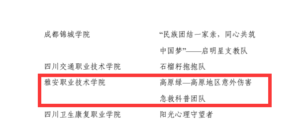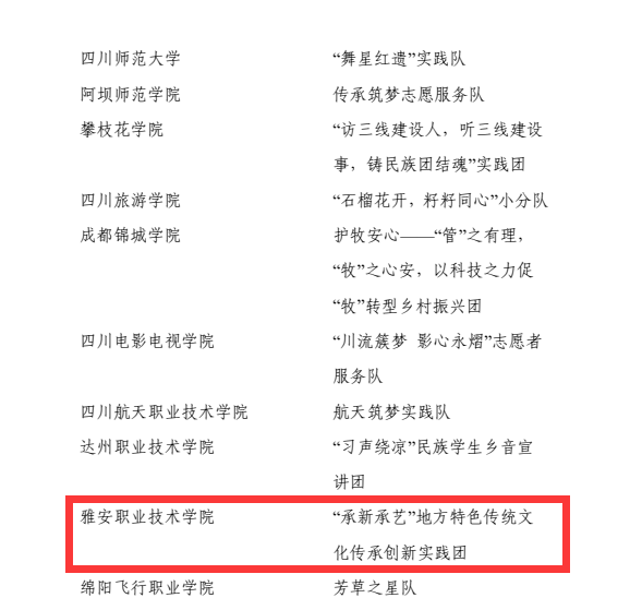 近日,共青团四川省委学校部公布2023 年四川省大中专学生志愿者暑期文化科技卫生“三下乡”社会实践活动重点团队名单。学院“承新承艺”地方特色传统文化传承创新实践团入选全国重点团队,高原绿——高原地区意外伤害急救科普团队入选省级重点团队。
