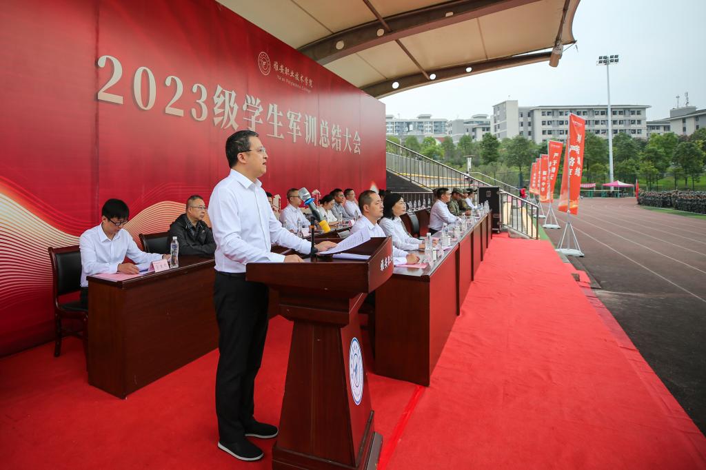 校园书声琅,操场秋点兵,学院2023级新生为期14天的军事技能训练顺利完成。9月28日,2023级新生军训总结大会在经开区校区和青年路校区同步举行。学院党委书记李春模,党委副书记、院长黄诚,雅安军分区大校司令员梅旭东出席大会,两校区总结大会分别由学生处处长徐维、副处长陈淼玲主持。